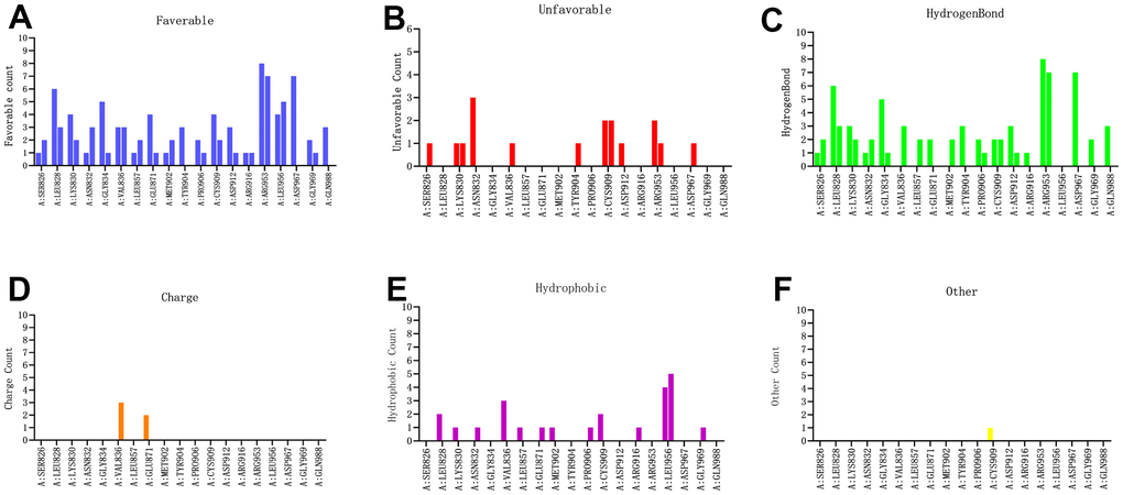 To further observe the detailed residues alteration information during docking process between the candidate compounds and JAK3, this study calculated that there were favorable counts, unfavorable counts, hydrogen bond counts and hydrophobic counts, respectively. As shown in Figure 8, results illustrated that during docking process, most of the favorable counts, hydrogen bond counts and hydrophobic counts participated in the site docking, while unfavorable counts rarely contributed to the docking complex, indicating that these residues all prompted the stability of ZINC000072131515-, ZINC000014952116- and ZINC000003938642-JAK3 complex.