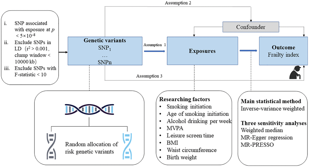 Mendelian randomization (MR) provides a novel analytic method that utilizes genetic variants of exposure as instrumental variables to estimate the causal association between exposure and health outcome [17]. Since genetic variants are randomly allocated and fixed at conception, MR studies can avoid reverse causality and are less vulnerable to confounders than conventional observational studies. Therefore, we applied two-sample MR to investigate the causal link between overall obesity (indicated by body mass index (BMI)), abdominal obesity (indicated by waist circumference), birth weight, and lifestyle factors (cigarette smoking, alcohol consumption, moderate-to-vigorous intensity physical activity (MVPA), and leisure screen time) and the risk of the frailty index (Figure 1).
