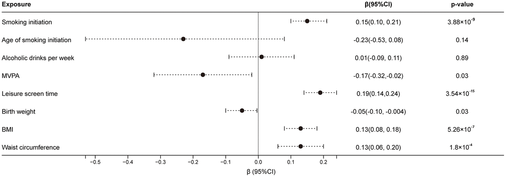 According to the inverse-variance weighted (IVW) method, the principal statistical method, highly genetically predicted smoking initiation, longer leisure screen time, higher BMI and waist circumference were associated with an elevated risk of frailty (Figure 2). The β of the frailty index was 0.15 (95% confidence interval (CI), 0.10, 0.21; p = 3.88 × 10−9) for 1-standard deviation (SD) increase in the prevalence of smoking initiation, 0.19 (95% CI, 0.14, 0.24; p = 3.54 × 10−15) for 1-SD increase in leisure screen time, 0.13 (95% CI, 0.08, 0.18; p = 5.26 × 10−7) for 1-SD increase in BMI and 0.13 (95% CI, 0.06, 0.20; p = 1.80 × 10−4) for 1-SD increase in waist circumference. There was a suggestive association between genetically predicted higher birth weight (β for per 1-SD increase, −0.05, 95% CI, −0.10, −4.10 × 10−3; p = 0.03) and MVPA (β, −0.17, 95% CI, −0.32, −0.02; p = 0.03) with the risk of the frailty index. We observed no causal association between genetically predicted age of smoking initiation (β, −0.23, 95% CI, −0.53, 0.08; p = 0.14) and alcoholic drinks per week (β, 0.01, 95% CI, −0.09, 0.11; p = 0.89) with frailty index. In the three sensitivity analyses performed, the weighted median method and Mendelian randomization pleiotropy residual sum and outlier (MR-PRESSO) method remained completely consistent with the IVW method, with the MR-Egger regression method having a slightly different effect (Table 1).