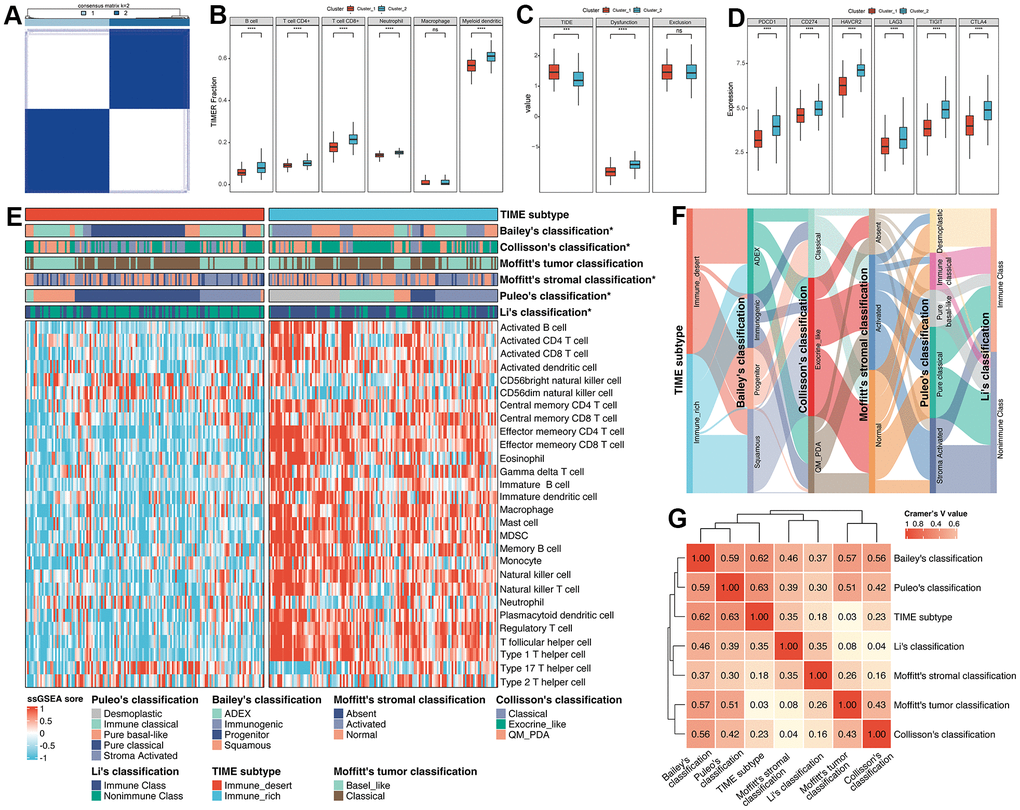 Then, we compared the identified TIME subtype with classical molecular classifications in PC. The marker of Bailey’s classification, Collisson’s classification, Moffitt’s tumor classification, Moffitt’s stromal classification and Li’s classification were utilized to cluster PC patients in the meta-cohort (Supplementary Figure 2A–2E and Supplementary Table 5), and Puleo’s classification was predicted followed the pipeline in Materials and Methods (Supplementary Table 5). Results illustrated that there was no significant difference between Moffitt’s tumor classification and TIME subtype (p = 0.70, Supplementary Table 6), while Bailey’s classification (p < 0.0001), Collisson’s classification (p = 0.0006), Moffitt’s stromal classification (p = 0.0101), Puleo’s classification (p < 0.0001) and Li’s classification (p < 0.0001) obtained significant similarity (Supplementary Table 6). For the comparison of Bailey’s classification, results showed that the proportion of immunogenic subtype was higher and the percentage of progenitor subtypes was lower in Immune_rich subtype versus Immune_desert subtype (35.25% vs 3.45%, 1.44% vs 40.69%, p < 0.0001, Supplementary Table 6). Interestingly, Collisson’s classification, we observed that Immune_rich subtype was composed of a more exocrine-like subtype and a less classical subtype compared to Immune_desert subtype (56.12% vs 41.38%, 14.39% vs 33.79%, p < 0.01, Supplementary Table 6) of Puleo’s classification. For Moffitt’s stromal classification, results demonstrated that Immune_rich subtype possessed a more normal subtype and less activated subtype than Immune_desert subtype (51.80% vs 35.17%, 36.69% vs 44.14%, p < 0.05, Supplementary Table 6). With respect to Puleo’s classification, the frequency of desmoplastic and immune classical was higher within Immune_rich subtype (30.94% vs 0.69%, 23.74% vs 2.76%, p < 0.0001, Supplementary Table 6). On the contrary, we also found a lower frequency of pure basal-like and pure classical subtypes in Immune_rich subtype versus Immune_desert subtype (7.19% vs 18.62%, 10.79% vs 52.41%, p < 0.0001, Supplementary Table 6). In terms of the integration of Li’s classification, we observed that Immune_rich subtype had a positive tendency to enrich in immune class and a negative correlation with nonimmune class, compared to Immune_desert subtype (68.35% vs 33.1%, 31.65% vs 66.90%, p < 0.0001, Supplementary Table 6). Moreover, the correlation between TIME subtype and other published molecular subtypes was quantified by Cramer’s V (Figure 2F, 2G). Results revealed that TIME subtype had the highest correlation with Puleo’s classification (Cramer’s V value = 0.63) and the lowest relationship with Moffitt’s tumor classification (Cramer’s V value = 0.03), probably owing to the deconvolution algorithm applied on tumor cells by Moffitt et al. Additionally, after integrating the TIME subtype and Puleo’s classification, we found that patients with Immune_rich and immune classical subtypes obtained the best survival, while the patients with Immune_desert and pure basal-like subtype had the worst survival (only one patient with Immune_desert and desmoplastic subtype was excluded) (p < 0.0001, Supplementary Figure 3), implying that combination of TIME subtype and Puleo’s classification may guide the prognostic prediction of PC.