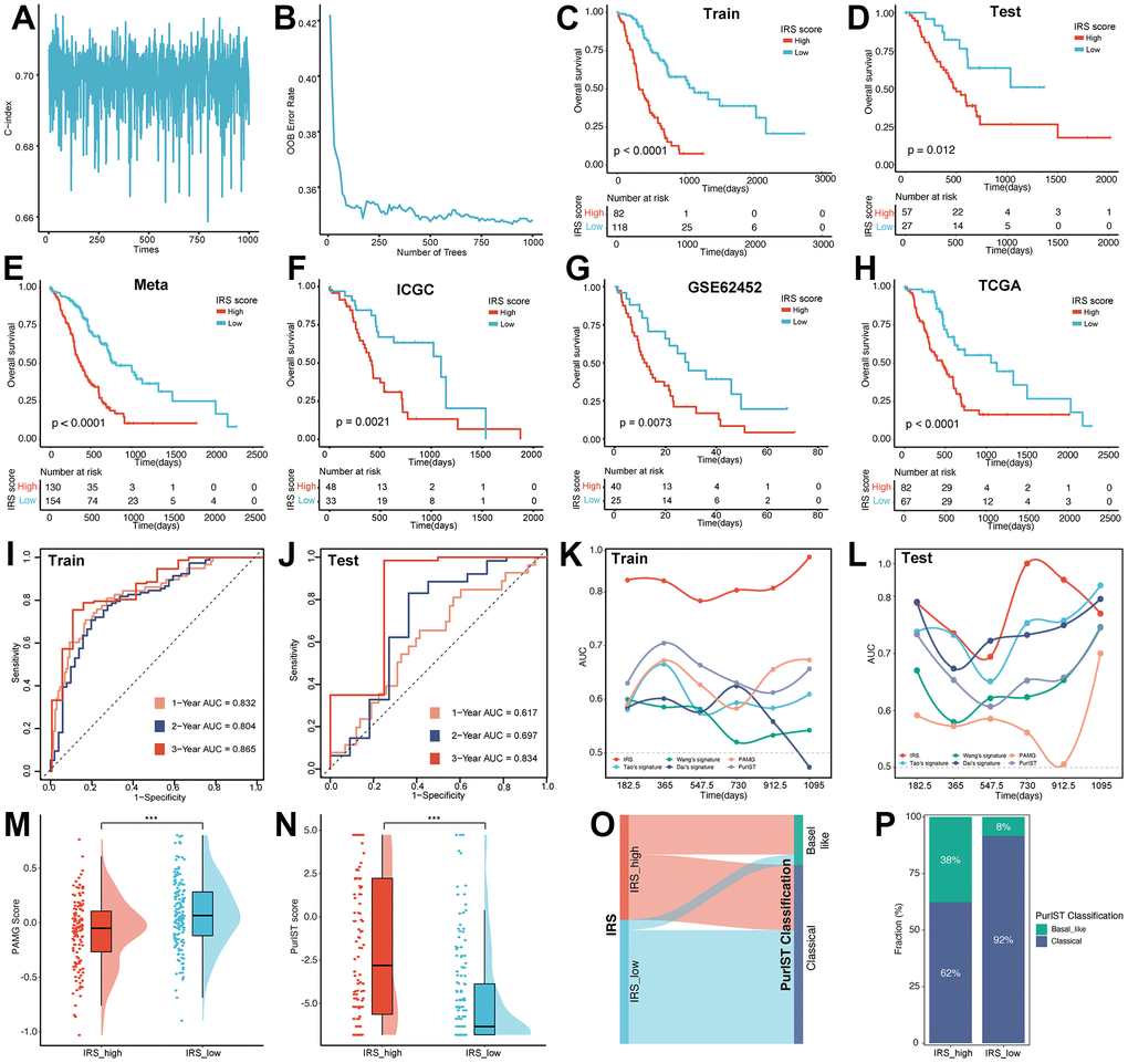 PC patients in meta-cohort were categorized into the training set and testing set at the ratio of 7:3. Then, in order to screen the prognostic DEGs, the Bootstrapping univariate Cox analysis was conducted by the “survival” R package. Furthermore, RSF analysis was applied to dimension reduction. The highest C-index of out-of-bag samples was used as the best model and the underlying gene set was observed, and this gene set was defined as IRS. Finally, The IRS scoring model was constructed with the correlation coefficients obtained from multivariate Cox regression, and the formula was as follows: