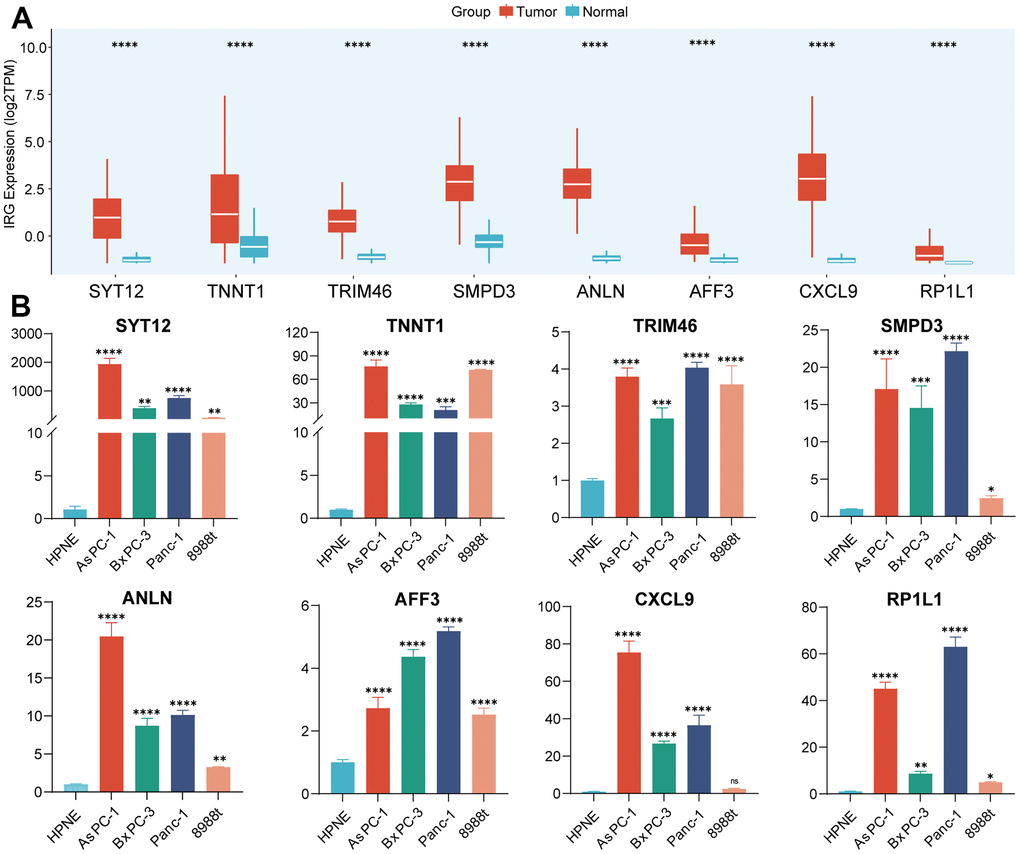 As mentioned above, a total of eight genes were selected to construct the IRS based on machine-learning algorithm. Then, we distinguished the aberrant expression of these IRGs in PC and normal pancreatic samples. As illustrated in Figure 4A, all of these IRGs were upregulated in PC samples. qRT-PCR was also performed to validate the differential expression patterns of IRGs between normal pancreatic cell line (hTERT-HPNE) and 4 PC cell lines (AsPC-1, BxPC-3, PANC-1 and PaTu 8988t) (Figure 4B), results suggested that the expression of these eight genes was higher in all four types of pancreatic cancer cells than in normal pancreatic cells. Owing to the significant upregulation of these hub genes, they may serve as potential targets of PC which suggested further research.
