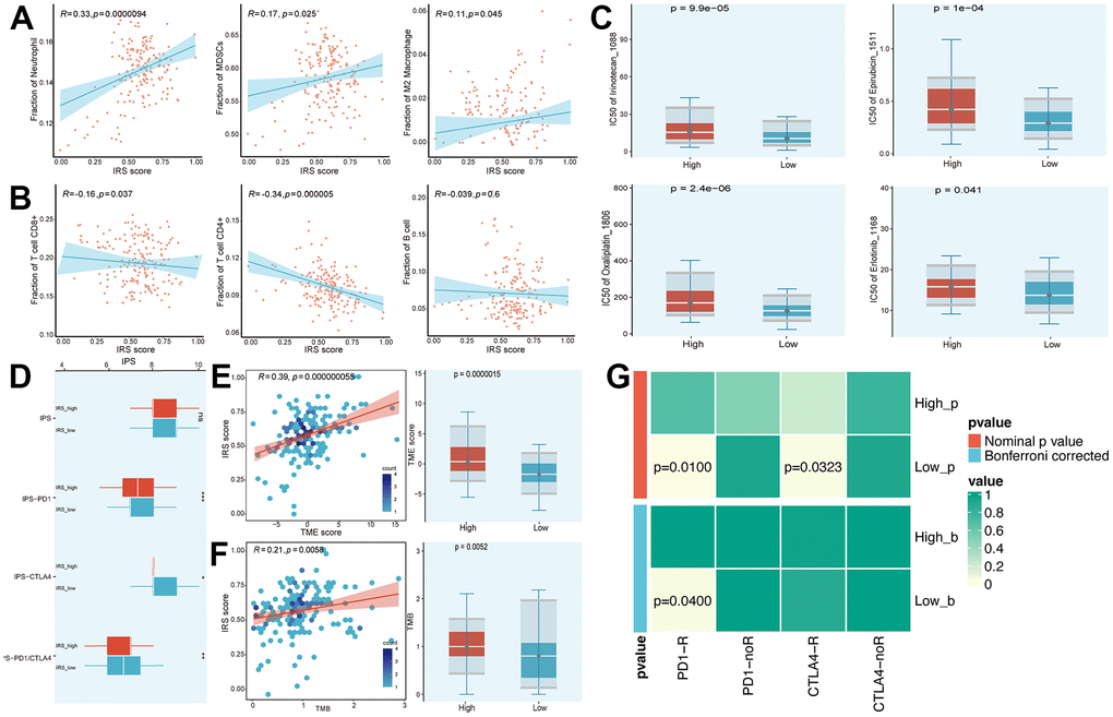 As the IRS was established based on prognostic IRGs, we first analyzed the relationship between the IRS score and the infiltration of immune cells. The IRS score was positively correlated with neutrophils, myeloid-derived suppressor cells (MDSCs) and M2 macrophages. On the contrary, CD8+ T cells and CD4+ T cells displayed a negative relationship with the IRS score (Figure 5A, 5B). Moreover, we suggested that the IRS may predict the sensitivity of chemotherapy by comparing the IC50 of multiple chemical compounds between IRS_high and _low groups. As shown in Figure 5C, patients who gained a lower IRS score tended to be more sensitive to chemotherapy. In terms of the prediction value of IRS in the treatment of ICB, we calculated the immunophenoscore (IPS), IPS-CTLA4, IPS-PD1 and IPS-PD1-CTLA4 scores, which are quantitative indexes to access the treatment of ICBs, were higher in the IRS_high group (Figure 5D). Furthermore, we compared the distribution of Tumor microenvironment (TME) and tumor mutation burden (TMB) scores in IRS_high and _low subgroups to evaluate whether the IRS could predict the clinical response to ICB therapy. Results exhibited that the TME and TMB scores were higher in the IRS_high subgroup and both had a positive correlation with the IRS score (Figure 5E, 5F). Since the IRS had a remarkable correlation with the TIME of PC mentioned above, we further determined whether the IRS could predict immunotherapeutic response in PC via SubMap analysis. We evaluated the similarity of the expression module of immune-related gene expression profiles between our cohorts and a cohort of 32 melanoma patients receiving ICB therapy [13]. Results illustrated the similarity between patients in the IRS_low group and patients who responded to anti-PD-1 and anti-CTLA4 immunotherapy (Figure 5G). All these results implied that the IRS_low group may have better feedback in immunotherapy compared to IRS_high group, which needs to be further validated in immunotherapy cohorts of PC.