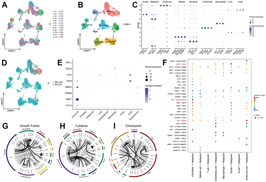To further recognize the TIME personalized features of pancreatic cancer, scRNA-seq data from 24 PC samples were utilized to reveal the potential mechanism of IRS-promoted PC progression. 22910 cells were screened after quality checks according to the aforementioned research methods. According to the marker genes extracted from the literature, 9 clusters were determined and then annotated to 9 cell types (Figure 6A–6C): malignant, fibroblast, stellate cell, T cell, endothelial cell, macrophage, ductal, B cell and endocrine cell. To unveil the mechanism of the IRS, we evaluated the distribution of IRS scores in 9 cell types. As illustrated in Figure 6D, higher IRS scores were mainly congregated in malignant cells, which could explain the poor prognosis of high IRS PCs. We also checked the expression of IRS in 9 cell clusters. SMPD3 and TNNT1 were significantly expressed by malignant cells, while AFF3 and ANLN were mainly expressed by B cells (Figure 6E). Therefore, we suggested that malignant cells may contribute to the specific TIME in IRS. Cell-cell communication demonstrated that fibroblast had a significant influence on malignant cells via MIF-(CD74+/CD44) interactions, and ductal cells affected malignant cells through SPP1-CD44 interactions (Figure 6F). Meyer-Siegler KL [14] found that blocking MIF-CD74 interactions may provide new targeted specific therapies for androgen-independent prostate cancer. SPP1-CD44 axis was reported to promote the interplay between CAF and enrichment of stemness population in PC [15]. These results demonstrated that fibroblast cells and ductal cells might promote the progression of cancer via MIF-CD74 and SPP1-CD44 axis, respectively. In addition, CTGF-LRP1 interactions between fibroblast cells and malignant cells could also cause the development of cancer (Figure 6G, 6H). In fact, the expression of HAVCR2 and ITGB2 was higher in macrophage and B cells, while the expression of LGALS9 was upregulated in fibroblast cells and malignant cells (Figure 6I). These results revealed that fibroblast cells might prohibit the activation of immune cells, leading to the “immune dessert” status of PC. Hence, IRS may promote the progression of tumor and suppress the immune system in TIME.
