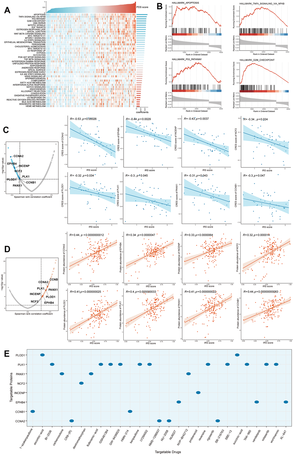 In terms of 8 targets screened from Drug Repurposing Hub and CCLE datasets, it is reported that the high expression of CCNA2 is associated with a worse prognosis in PC and is correlated with advanced tumor stage [50]. Inhibition of EPHB4 combined with radiation can modulate the microenvironment response post-radiation, contributing to increased tumor control in PC [51]. PLOD genes or PLOD family genes also could be served as potential prognostic biomarkers for PC [52]. PLKT1 suppresses PC progression and inhibits NF-κB activity, and targeting PLKT1 can alleviate the sensitivity of immunotherapy in PC [53]. The up-regulation of PANX1 was correlated with poor outcomes and immune infiltration in PC [54]. CCNB1 silencing suppresses cell proliferation and promotes cell senescence by activating the p53 signalling pathway in PC [55]. Although INCENP and NCF2 haven’t been reported in PC, it needs further exploration could concentrate on these two novel targets. Moreover, we identified Canertinib as the most reliable agent targeting high IRS score PCs based on CTRP and PRISM datasets. Canertinib, an EGFR inhibitor, has been demonstrated effective in pNETs according to available genetic atlas data [56]. But unfortunately, its clinical efficiency in PC has been insofar moderate. Current work provides new insights into improving the therapeutic effect of PC, offering new directions for the precision treatment of PC.