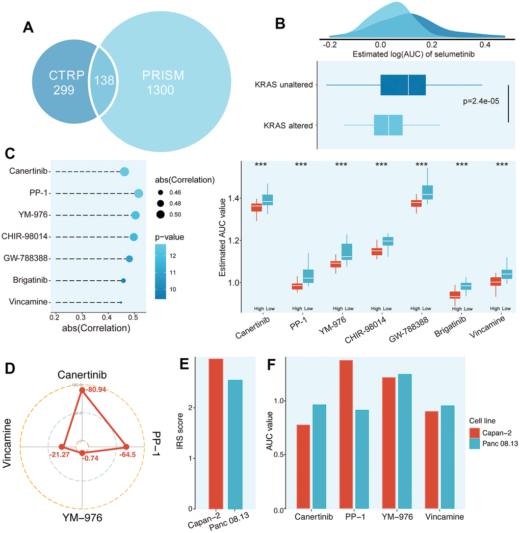 For drug response prediction, many machine learning (ML) methods have been reported, ranging from multivariate linear regression and support vector machine (SVM) to RF and k-nearest neighbours (KNN). Among ML methods, linear regression methods, such as ridge regression and elastic net, tend to exhibit good and robust performance in different settings [16]. Therefore, ridge regression model located in the “oncoPredict” package, which has been applied to multiple studies and proven to be reliable, was applied to estimate drug response of clinical samples in this study [17]. Before selecting the compounds, we further validated the predicted drug sensitivity (AUC) in our cohort. Selumetinib, a PI3K pathway inhibitor, was reported to improve the prognosis in the treatment of KRAS-mutant patients compared to those without KRAS mutations [18]. Thus, we classified PC patients into KRAS altered and KRAS unaltered subgroups. The AUC of PC patients in the KRAS altered group was significantly decreased (Figure 8B, P = 2.4e-05), which was consistent with the clinical findings of Simertinib above. Finally, 1 compound from the CTRP database (Canertinib) and 6 compounds from the PRISM database (PP-1, YM-976, CHIR-98014, GW-788388, Brigatinib and Vincamine) were obtained following the protocol described in Materials and Methods (Figure 8C).