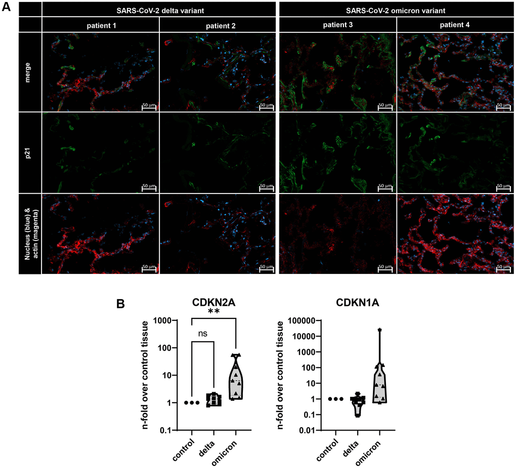 To identify the impact of two distinct entry mechanisms previously described, namely the membrane fusion of the delta variant and the CME of omicron, we analyzed the lungs of deceased COVID-19 patients (Figure 1) [3, 4]. For this, the lungs of two delta-variant infected patients and the lungs of two omicron variant infected patients were investigated by using immunofluorescence staining (Figure 1A). Here, a positive signal for p21 was confirmed for both variants. Notably, a stronger signal was identified for the omicron variant (Figure 1A). To quantify these qualitative results, we assessed the gene expression levels of both CDKN2A (p16) and CDKN1A (p21) in lung biopsies from three deceased patients per virus variant. Once more, infection with the omicron variant resulted in a significant upregulation of CDKN2A in lung tissue when normalized to uninfected control tissue. Additionally, the expression level of CDKN1A was also upregulated, although it did not reach statistical significance (Figure 1B).