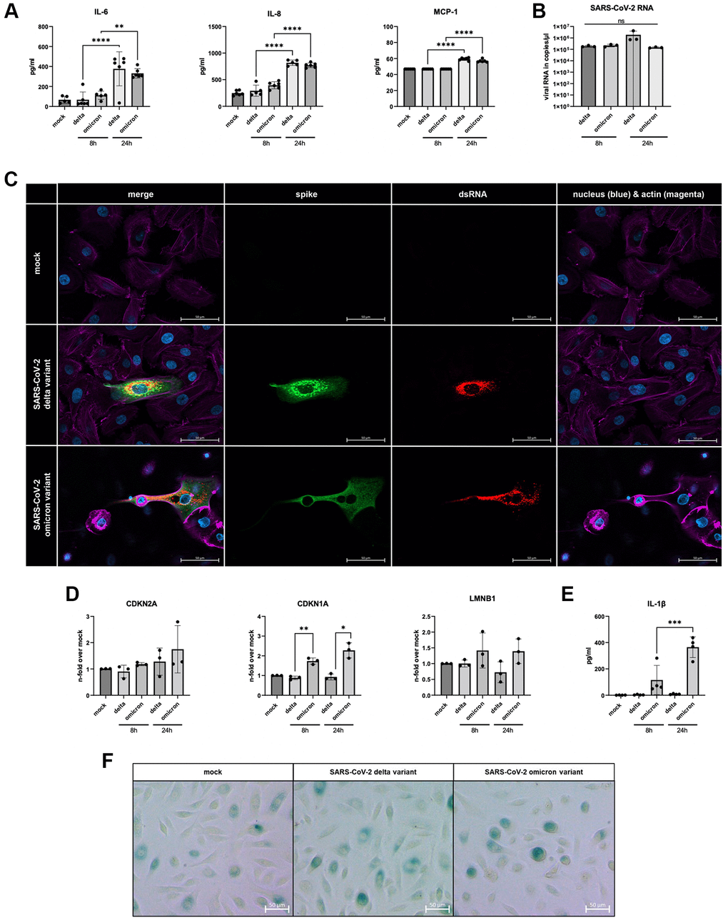 Cellular senescence was analyzed once more via the determining the gene expression profile. A significant increase in CDKN1A mRNA was detected. The other analyzed marker CDKN2A and LMNB1 did not exhibit equally distinct results. Nevertheless, LMNB1 displayed a similar trend, with the highest average expression in omicron-infected cells (Figure 2D). Notably, the SASP-associated inflammatory protein IL-1β was detectable exclusively in omicron-infected cells (Figure 2E). Additionally, β-Galactosidase was stained in SAECs 24 h p.i. (Figure 2F). Upon examination, is important to note that it does not provide a clear qualitative difference between uninfected and both SARS-CoV-2 variants. However, it is worth mentioning that we did observe partially darker cells in infected samples. Moreover, there was an alteration in cell shape of SAECs infected with SARS-CoV-2 omicron (Figure 2F).