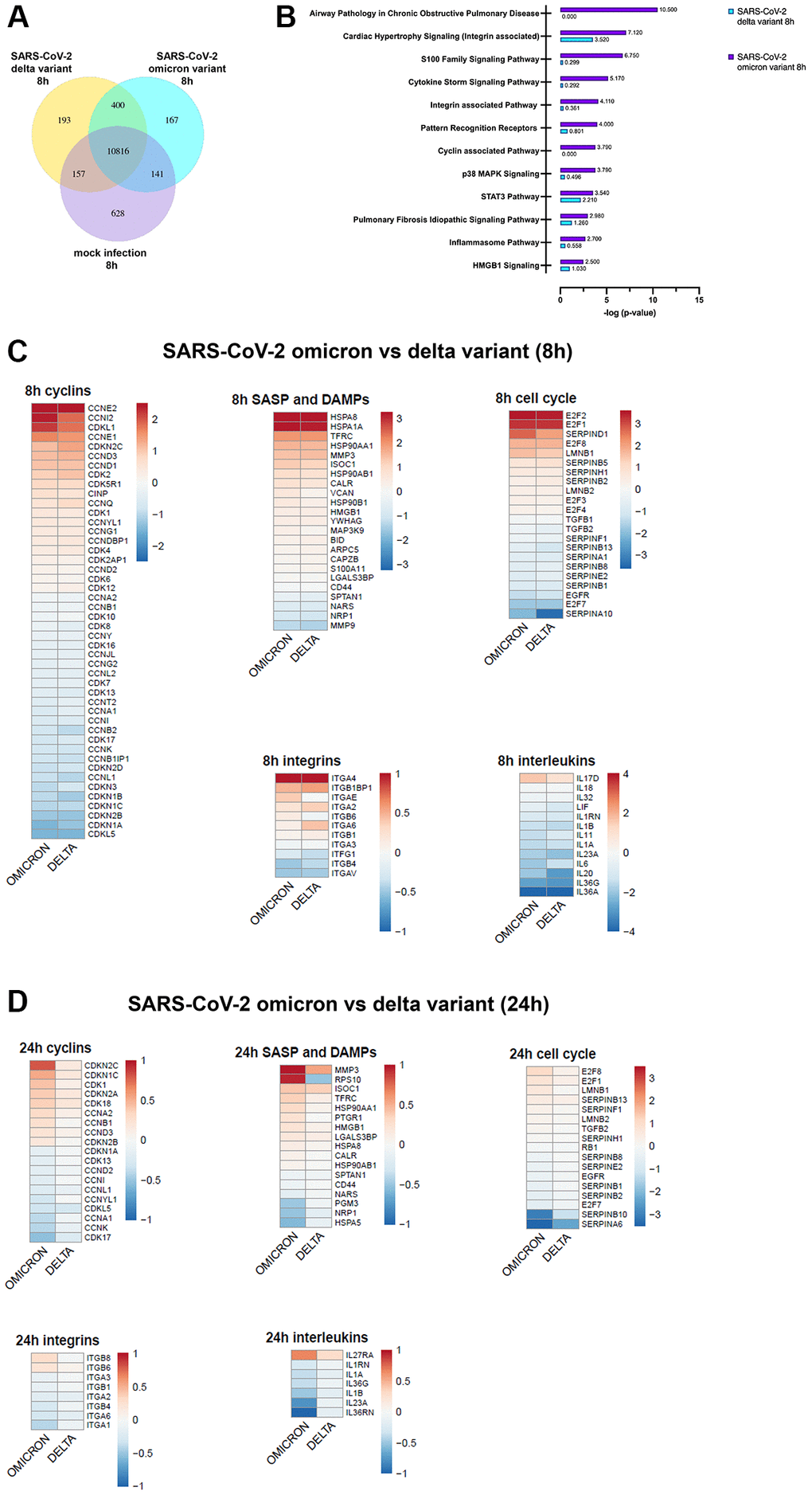Infection with SARS-CoV-2 affected the expression of cyclins, MAPK signaling genes, integrins, and cell cycle related genes (Figure 3C, 3D). Interestingly, after 24 h of omicron infection significant modifications of cell cycle related genes could be detected (Figure 3D). Cell cycle arrest was confirmed by the upregulation of p16 (CDKN2A), E2F1 and E2F8 after 24 h post infection with omicron (Figure 3D). MMP3 and HMGB1 were increased by both variants at both timepoints (Figure 3C, 3D). Interestingly, this rise was persistent in omicron variant and amplified even more after 24 h. (Figure 3D).