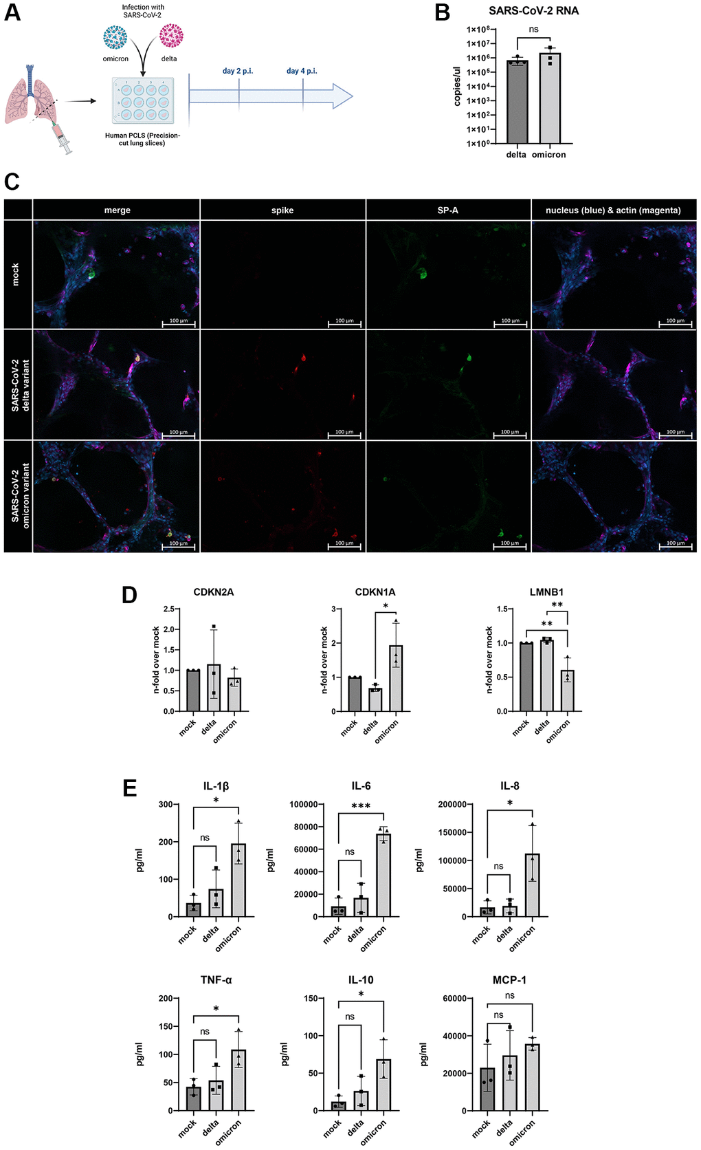 The determination of mRNA-expression shows an upregulation of parameters of cellular senescence. Interestingly, solely omicron-infected slices indicate an increased expression of CDKN1A with a decreased expression of LMNB1 (Figure 4D). Additionally, the analysis of SAPS-related inflammatory cytokines and chemokines in the supernatant of the infected lung slices revealed that infection with the omicron variant exclusively triggered an increased secretion of IL-1b, IL-6, IL-8, TNF-α, and IL-1β. While values for MCP-1 were on average highest in omicron slices, they did not reach statistical significance (Figure 4E).