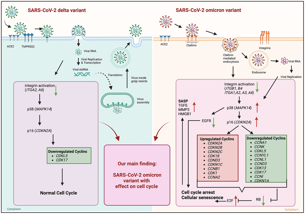 Viral infections contribute to the pathogenesis of premature aging [13]. In previous work we investigated the effects of influenza A virus infection and the impact on cellular senescence following an acute infection [14]. However, despite the here reported paracrine effects, it remains unclear whether SARS-CoV-2 virus variants have the potential to induce cellular senescence and the mechanisms involved. Several studies have highlighted the occurrence of cellular senescence in COVID-19 infections. For instance, Nehme et al. in 2020 discussed the potential role of cellular senescence as a contributor to COVID-19 pathogenesis [15]. Our study provides insights in virus induced cellular senescence by using the SARS-CoV-2 delta and omicron variant. Both variants differ in their entry mechanism, leading to the activation of distinct intracellular signaling pathways (Figure 5). For the omicron variant, up to 60 mutations have been identified compared to the delta variant and the host-entry process has undergone a considerable modification [3].