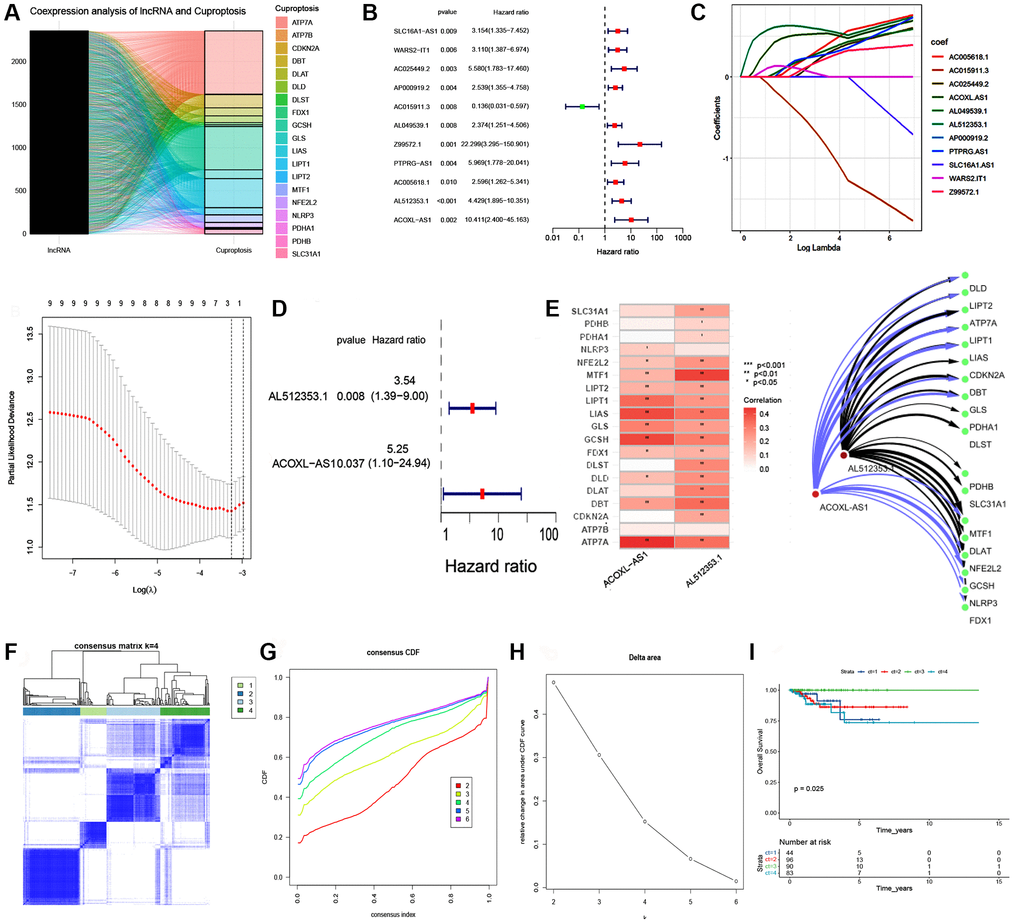 In the EEA cohort within TCGA, we obtained nineteen cuproptosis-related genes and 16,876 lncRNAs that were annotated by NCBI GenBank, Ensembl, and GENCODE. By co-expression analysis, 941 cuproptosis-related lncRNAs were found, and associations are visualized in the Sankey plot (Figure 1A). Eleven CRLs associated with prognosis were mined by univariate Cox regression analysis (Figure 1B, P < 0.05). The least absolute shrinkage and selection operator (LASSO) is an efficient gene selection method [30]. A total of 11 lncRNAs were selected to fit a LASSO regression model, the next step was to find the most appropriate values for λ (=0.00659) using 10-fold cross-validation (Figure 1C). Finally, two cuproptosis-related lncRNAs (AL512353.1, ACOXL-AS1) were identified by LASSO and Multivariate Cox regression analysis (Figure 1C, 1D). Cytoscape software was employed to visualize associations between lncRNAs and cuproptosis-related gene (Figure 1E).
