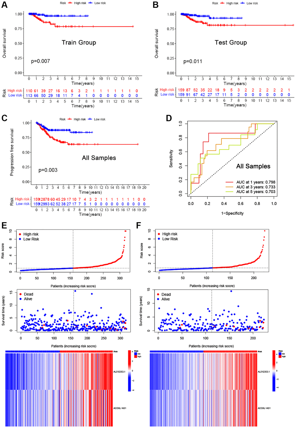 Patients were divided into high and low risk groups using the median risk score as the cutoff value.