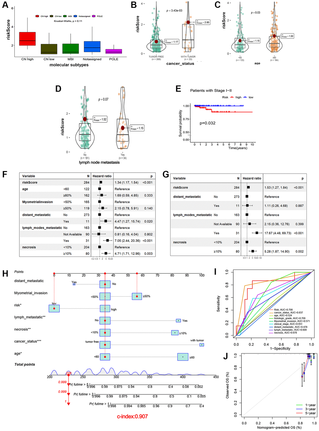 A nomogram model including all seven clinicopathologic factors was constructed to predict survival probability by adding all the points associated with the seven factors (Figure 3H). The higher the score, the greater the likelihood of death. The result showed that risk, age, lymph node metastasis, necrosis and cancer status were correlated with OS (p < 0.05). To validate reliability of the nomogram, the AUC values were calculated. Internal validation showed an AUC value of 0.816 (Figure 3I), a total C-index value for predicting OS of 0.907, and a C-index value of risk scores of 0.782. Calibration curves of the 1-, 3- and 5-year overall survival showed that the predicted OS was in good agreement with the observed OS (Figure 3J).