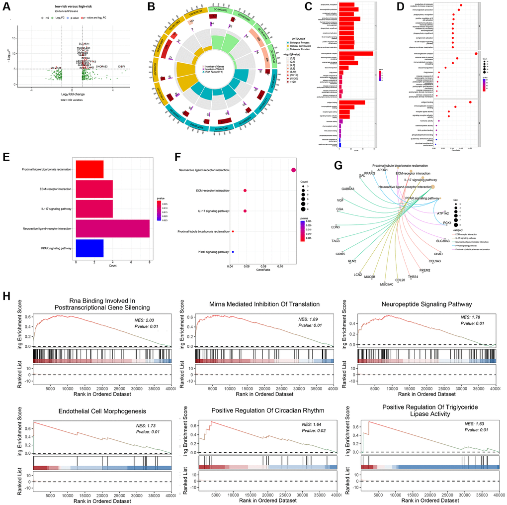 Identification of differentially expressed genes (DEGs) can be used to gain mechanistic insights from diseases [31]. When R package limma was used to analyze differentially-expressed genes between the high-risk and low-risk groups, 354 genes (228 up-regulated and 126 down-regulated genes) showed significant changes (Figure 4A). The results of Gene Ontology (GO) analysis indicated that the differentially expressed genes (DEGs) were significantly enriched in various biological processes (BP), molecular functions (MF) and cellular components (CC). Specifically, the enriched BP terms included the production of molecular mediators of the immune response, while the enriched MF terms involved immunoglobulin complex formation, antigen binding, immunoglobulin receptor binding, and receptor-ligand activity (Figure 4B–4D). Based on the Kyoto Encyclopedia of Genes and Genomes (KEGG) pathway analysis, the differentially expressed genes (DEGs) were associated with multiple pathways, such as neuroactive ligand-receptor interactions, ECM receptor interactions, and IL-17 signaling pathways (Figure 4E–4G). Furthermore, GSEA identified that biological pathways including positive regulation of triglyceride lipase activity and neuropeptide signaling pathway were differentially enriched in the high and low risk groups (Figure 4H).