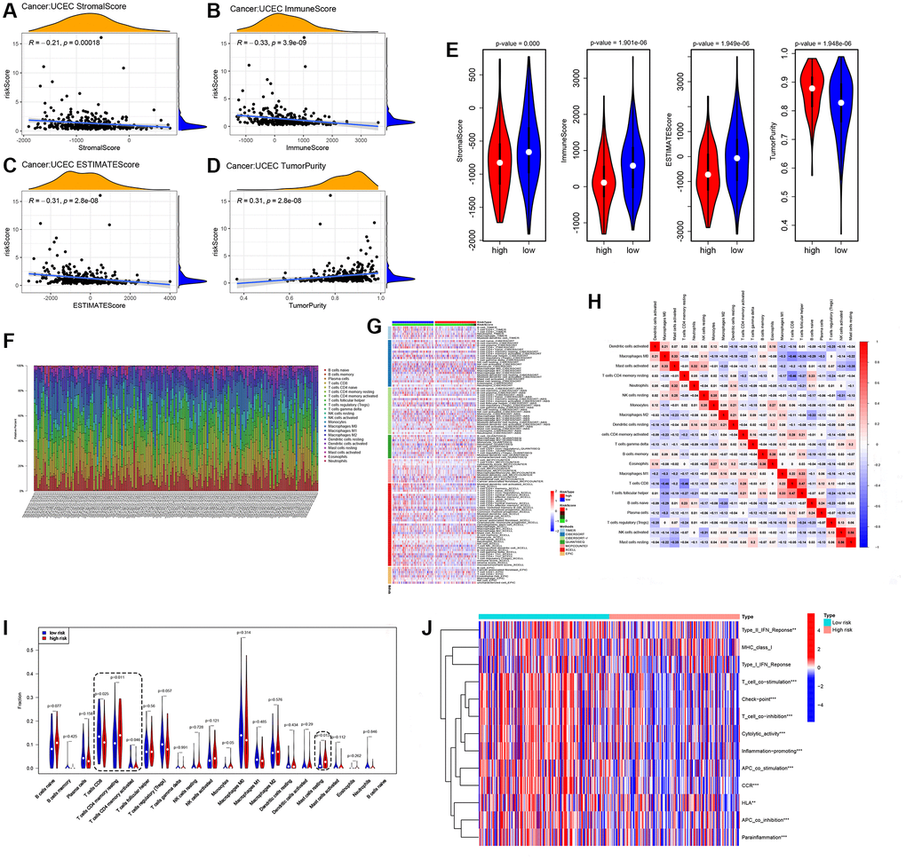A comprehensive understanding of the characteristics of the tumor immune microenvironment is essential for optimizing the efficacy of immunotherapy [49]. Tumor purity, immune score, and stromal score are three crucial factors that can exert significant influence on tumor progression [50]. Research has revealed that higher levels of tumor purity are generally associated with a poorer prognosis, as this suggests more aggressive cancer cells and a greater potential for metastasis. Conversely, a higher immune score has been positively correlated with better outcomes, as this indicates an effective recognition and attack of cancer cells by the immune system [51, 52]. Similarly, higher stromal scores have been associated with a worse prognosis, indicating a well-supported and thriving tumor with the capacity to grow and spread [52]. And just like the results above, we found that patients in the high-risk group have a lower interstitial score and immune score than those in the low-risk group.