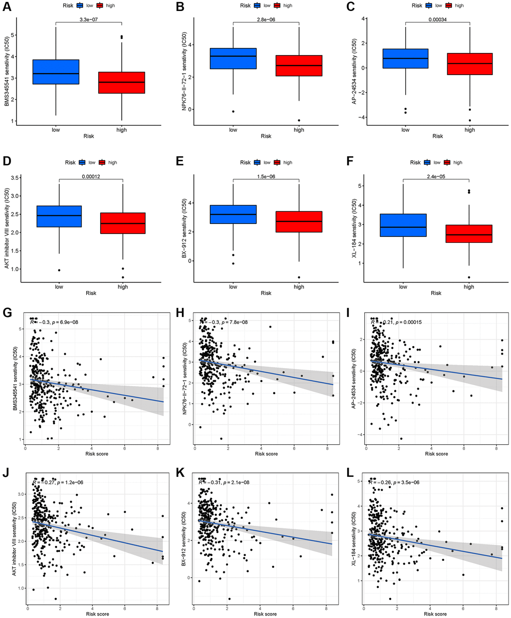 By identifying molecular signatures of cancer, the GDSC database helps predict tumor’s response to antitumor therapy [34]. A large difference in IC50 was found between high-risk and low-risk groups for six chemotherapy agents, such as AKT inhibitors (Figure 6A–6F). Simultaneously, there was a correlation between six drugs and risk score (Figure 6G–6L, p < 0.001).