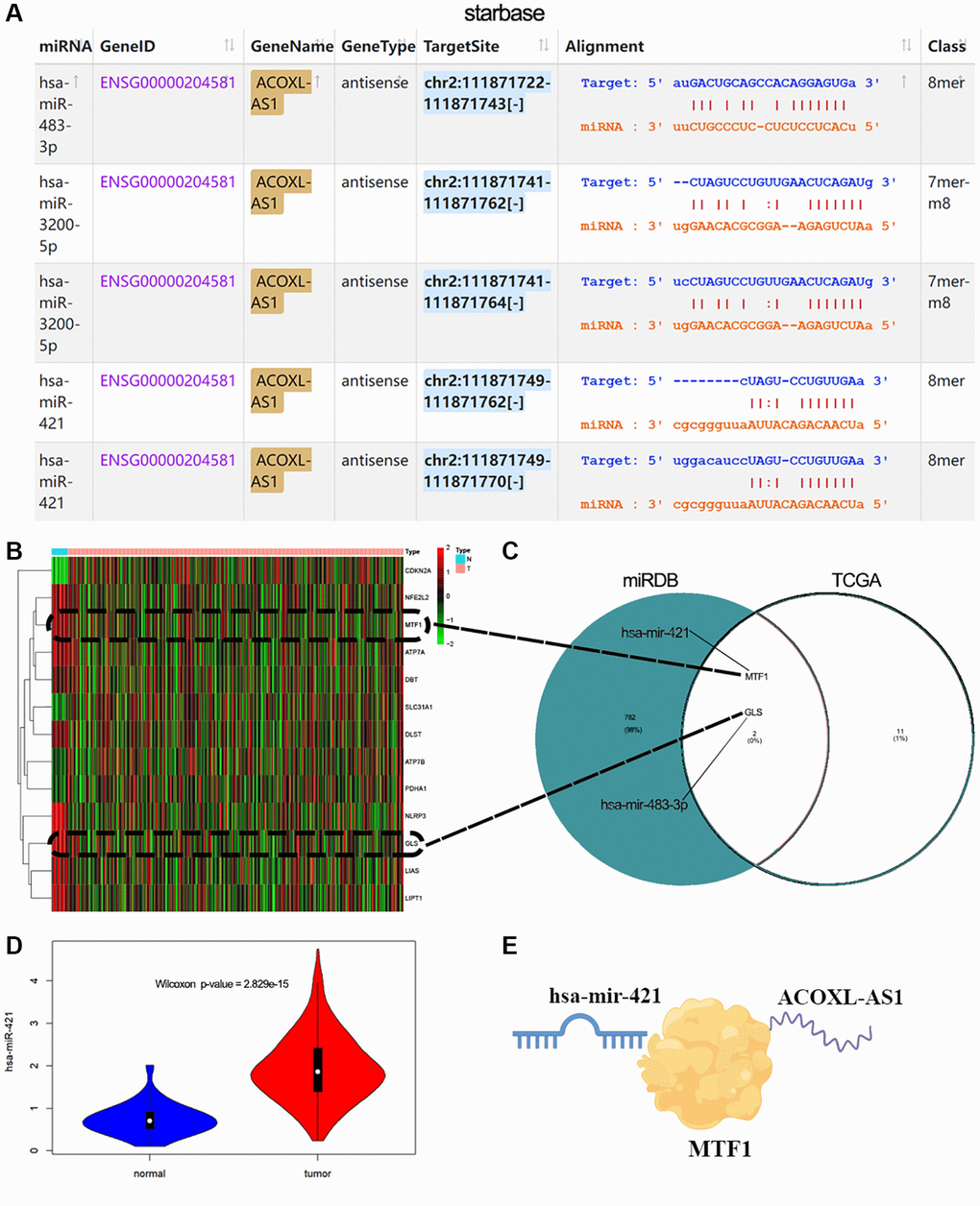 Using starBase query results, miR-421, miR-483-3p, and miR-3200-5p can bind to their lncRNA ACOXL-AS1 targets (Figure 7A). Then, we conducted a differential comparison analysis of genes related to copper death, and the heatmap showed that 13 genes were differentially expressed between normal and tumor group in TCGA-EEA (Figure 7B). The online database miRDB provides functional annotation and predictions for miRNA targets [35]. Through the miRDB database, we found 3 miRNAs targeting 784 unique genes, and intersecting with 13 copper death-related genes in TCGA. Two of these genes, MTF1 and GLS were related to miR-421 and miR-483-3p, respectively (Figure 7C). At the same time, we also found that miR-421 was highly expressed in tumors (Figure 7D, p < 0.01). Thus, ACOXL-AS1 can serve as an endogenous “sponge” to regulate the expression of MTF1 by miR-421 (Figure 7E).