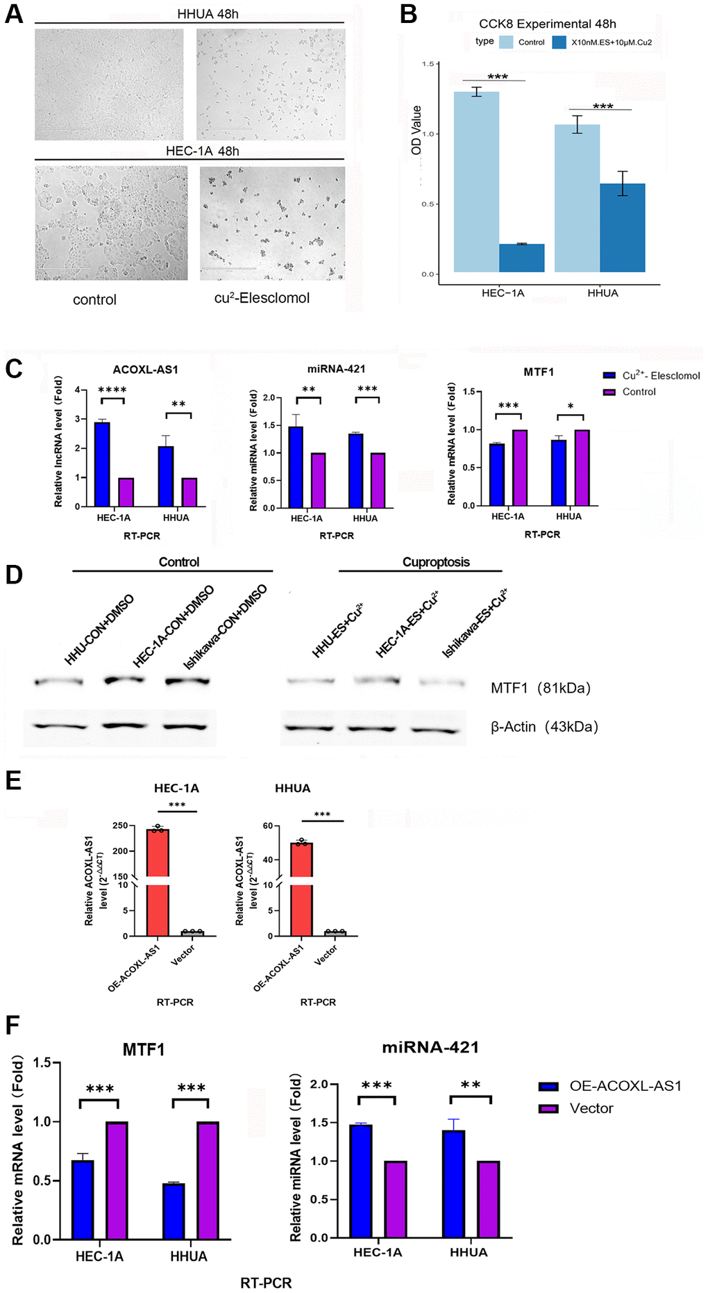 In addition, the Cu2+ plus Elesclomol-treated group showed significantly higher gene expression levels for ACOXL-AS1 and hsa-mir-421 (p < 0.01, Figure 8C), while low expression levels were observed for MTF1 gene and protein in two endometrial cancer cell lines (p < 0.01, Figure 8C, 8D).