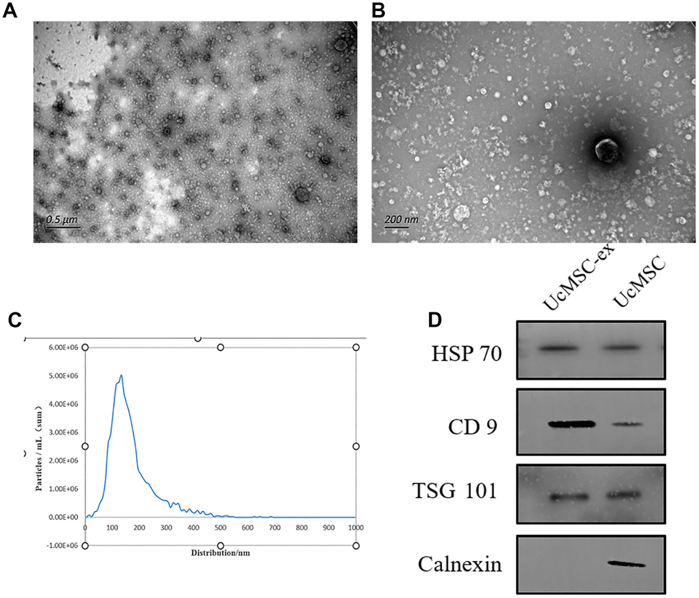 UcMSC-ex were meticulously characterized using transmission electron microscopy, which revealed a distinct cup-shaped morphology and a relatively uniform diameter (Figure 1A, 1B). Through Nanoparticle Tracking Analysis (NTA), the size distribution of exosomes was demonstrated, showcasing a predominant peak at 126.7 nm that accounted for 96.6% of the main peaks (Figure 1C). Further validation with Western blotting not only confirmed the expression of hallmark exosomal markers such as CD9, HSP70, and TSG101 but also noted the absence of Calnexin (Figure 1D). These combined results underscored the successful isolation of exosomes.