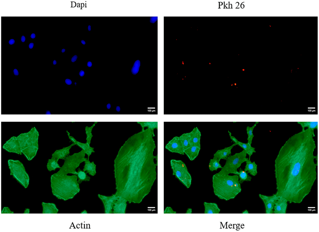 PKH26-labeled exosomes and VK2 cells were co-incubated at 37° C for 12 hours. Subsequently, the cells were fixed with 4% paraformaldehyde, nuclei stained with DAPI (Beyotime, China), and the cytoskeleton was stained with Actin-Tracker Green (Beyotime, China). After washing with 1% Triton ×100, images were captured using a Zeiss fluorescence microscope.