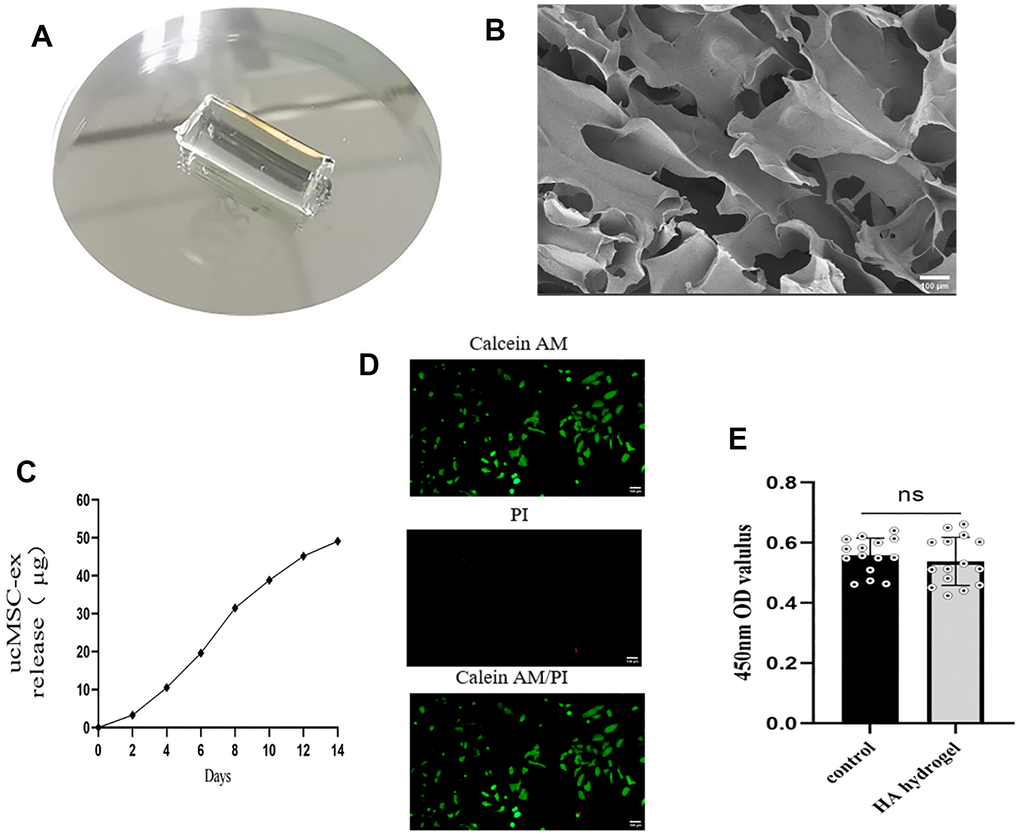 Post-photocrosslinking, the hyaluronic acid hydrogel took a cylindrical shape, measuring a diameter of 5 mm and a height of 1.0 cm (Figure 4A). SEM images revealed that the gel's interior hosted a loosely interconnected pore structure, affording ample space for accommodating exosomes (Figure 4B). As illustrated in the figure, the natural degradation of the hydrogel facilitated a slow, continuous release of the loaded exosomes (Figure 4C). To explore the biocompatibility of hyaluronic acid hydrogel, we conducted live/dead staining experiments. In these experiments, green fluorescence represented live cells stained with calcein AM, and red fluorescence indicated dead cells stained with PI (Figure 4D). The results indicated that the majority of VK2 cells remained viable after exposure to the hydrogel. Furthermore, additional CCK-8 analysis (Figure 4E) revealed no significant difference in cell viability between the two groups, demonstrating that the hyaluronic acid hydrogel exhibits excellent biocompatibility and is devoid of any cytotoxicity.