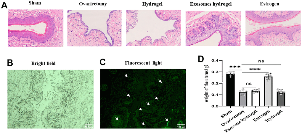 Figure 5A shows that the vaginal epithelium is the thickest in the sham operation group. The nuclei of the basal layer cells are large and deeply stained, aligned neatly in a palisade arrangement. The stratum corneum is complete, with spindle-shaped granular cells and non-nucleated squamous cells observable between the basal layer and the stratum corneum. In the ovariectomy group and hydrogel group, the epithelium is thin, the arrangement of basal cells is disordered, the number of cell layers is small, and the stratum corneum disappears. Papillary-like proliferation is observed at the vaginal base in the exosome hydrogel group, the epithelial cell layers increase in number, the thickness is considerably greater than the ovariectomy group, albeit slightly less than the sham operation group. The thickness of the vaginal mucosal cells in the estrogen treatment group and the sham operation group is similar, which is consistent with previous reports: estrogen can completely reverse the atrophy of the vaginal epithelium [19]. Moreover, when analyzing uterine weight across groups, there was no statistically significant difference observed between the exosome and hydrogel groups compared to the de-ovulated group (Figure 5D). This implies that the application of exosome hydrogel does not influence uterine weight.