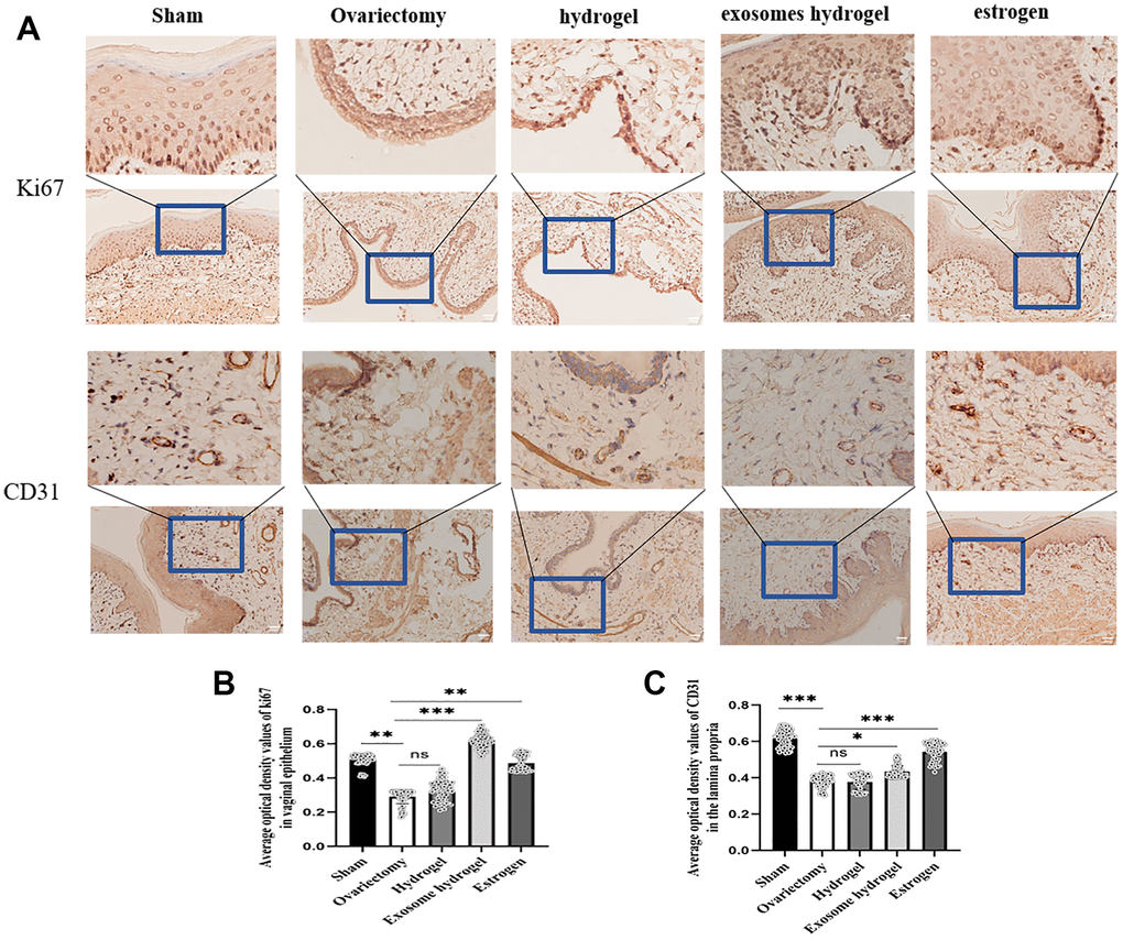 In an effort to ascertain the distribution of exosomes within the rat vagina, we examined vaginal slices marked with fluorescent DIR under a microscope. As can be discerned from the figure, green fluorescent-tagged exosomes were seen in the vaginal basal layer, sub-basal layer, and surrounding blood vessels, implying that exosome particles released from the hydrogel can be absorbed by tissue cells (Figure 5B, 5C). Ki67 is a classic marker of cell proliferation. Figure 6 reveals that the expression of epithelial cells in the vaginal mucosa is at its nadir in the ovariectomy group and the hydrogel group, yet, the exosome hydrogel treatment group exhibits the highest expression among all groups, with the sham operation group and the estrogen group showcasing similar expression levels. The expression level in the hydrogel treatment group mirrors that in the ovariectomy group, while it experiences a significant surge in the exosome hydrogel group, which underscores that the active proliferation of vaginal basal cells is primarily attributable to the effect of exosomes. Furthermore, we meticulously quantified the CD31-positive capillaries in the inherent layer, and as was expected, the count was the highest in the sham surgery group, trailed by the estrogen group. The quantity of CD31-positive microvessels diminished post-ovariectomy, but saw a revival following treatment with exosome hydrogel.