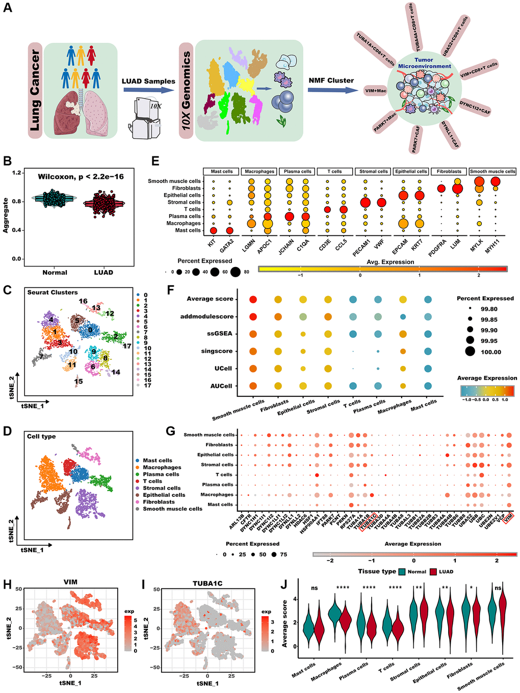 The workflow chart illustrates the general design of this study (Figure 1A). We found that the aggrephagy score was significantly increased in normal samples compared LUAD samples analyzed via the ssGSEA algorithm (Figure 1B, P < 0.001). We then examined the landscape of aggrephagy on each cell type by using the scRNA-seq data of LUAD. After using the Seurat pipeline, a total of 12,554 cells were divided into 18 clusters (Figure 1C) and were annotated with major cell types based on classical marker genes, including mast cells, macrophages, plasma cells, T cells, stromal cells, epithelial cells, fibroblasts, and smooth muscle cells (Figure 1D). Marker genes for each cell population showed a clear separation between each cell type (Figure 1E). To further investigate whether aggrephagy activity was dynamic among TME in LUAD scRNA-seq level, we quantified aggrephagy score using ssGSEA, AUCell, Ucell, addmodulescore, and singsore algorithms (Figure 1F). Interestingly, the outcomes demonstrated relatively heightened aggrephagy score in smooth muscle cells, fibroblasts, epithelial, stromal, and macrophage, while lower in T, plasma, and mast cells. Moreover, a comparison between average aggrephagy score in LUAD and normal tissues unveiled intriguing observations: macrophage, plasma, T, epithelial, and fibroblasts within tumors exhibited notably low average aggrephagy score, while stromal cells exhibited notably high average aggrephagy score (Figure 1J). As a result of comparing the expression patterns of aggrephagy genes across cell types in LUAD, we found that aggrephagy genes also showed high heterogeneity among cell types (Figure 1G). For instance, VIM exhibited higher expression levels in fibroblasts, and plasma cells, while showed lower expression levels in T cells and macrophages (Figure 1H). TUBA1C is highly expressed in macrophages and epithelial cells, but shared lower expression levels in other cells (Figure 1I), indicating the necessity for further investigation of aggrephagy genes by targeting specific cell types.