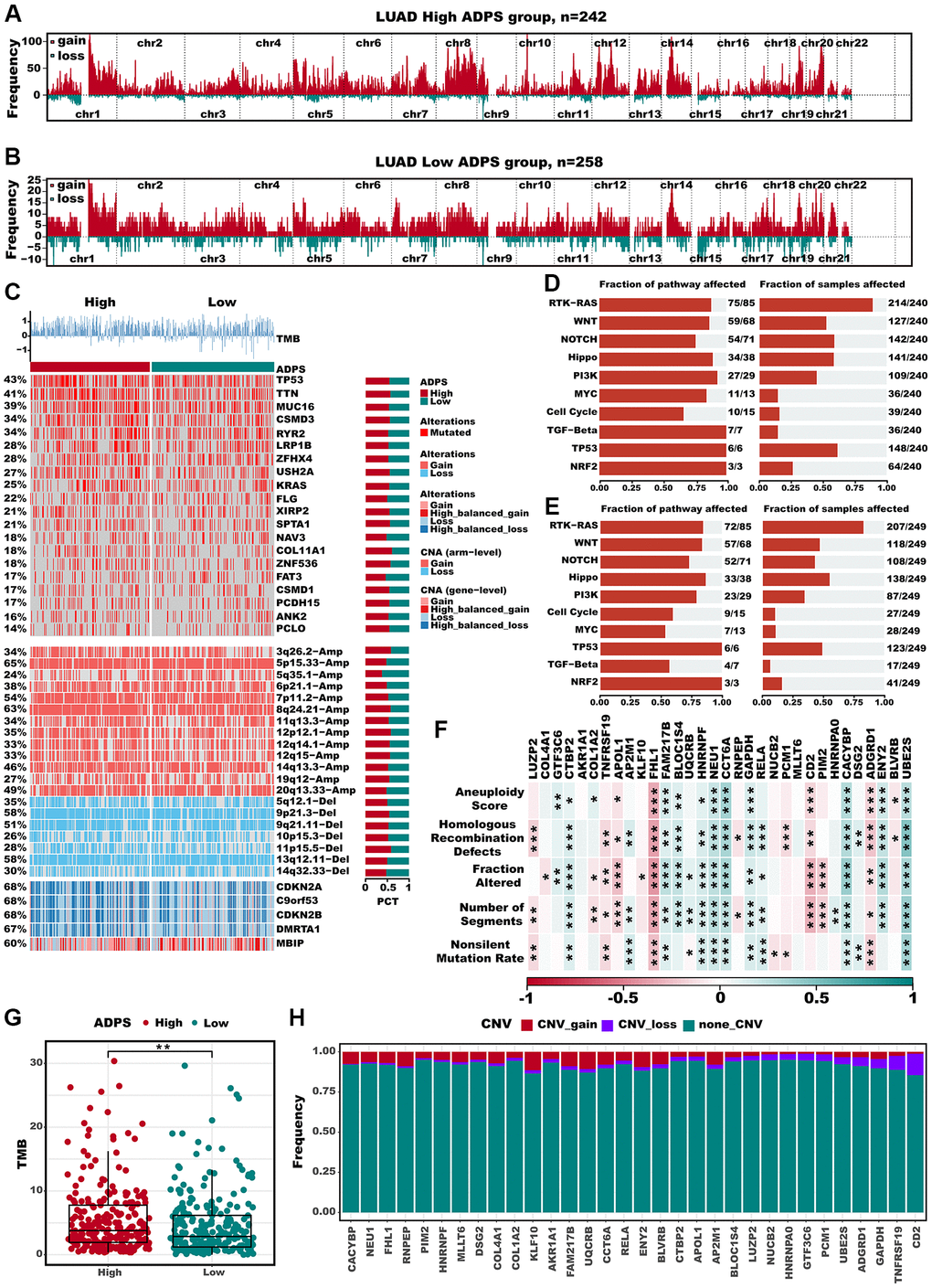 The differences in frequently altered chromosomes were detected in two ADPS groups (Figure 10A, 10B). We conducted an integrated analysis of mutations and copy number alterations (CNA, Figure 10C) to examine the genomic heterogeneity of the high and low ADPS groups. In the high ADPS group, we observed a higher frequency of mutations in classical tumor suppressor genes TP53 and CSMD3, as well as the oncogene KRAS, compared to the low ADPS group (Figure 10C). Additionally, compared to the low ADPS group, the high ADPS group showed significantly higher levels of amplification or deletion at the focal and chromosome arm levels, such as the amplification of 8q24.21, 12p12.1, as well as the deletion of 11p15.5, and 9p21.3 (Figure 10C). This finding was further supported at the gene level by the clear amplification of the oncogene MYC located at 8q24.21 and the distinct deletion of the tumor suppressor genes CDKN2A located at 9p21.3 (Figure 10C). Furthermore, we explored the mutation frequency of 10 major oncogenic pathways [55] between the high and low ADPS groups, and result found that both groups had detectable mutations in most of the oncogenic pathways, such as RTK-RAS, PI3K, TP53, NOTCH, and Hippo pathways (Figure 10D, 10E). We further explored the relationship between ADPS-related genes and LUAD by analyzing their correlations with different molecular signatures (Figure 10F). Our findings showed that FHL1 and ADGRD1 were strongly and positively correlated with molecular signatures associated with genomic instability in LUAD, including Aneuploidy Score, Homologous Recombination Defects, Fraction Altered, Number of Segments, as well as Nonsilent Mutation Rate. Additionally, the high ADPS group exhibited a higher TMB score in comparison to the low ADPS group (Figure 10G, P < 0.01). Only a small fraction of samples exhibited copy number variation (CNV) in the ADPS-related genes (Figure 10H). Additionally, we explored the single-nucleotide variant (SNV) mutations of the ADPS-related genes. It showed that COLA4A1, COL1A2, and LUZP2 had SNV mutations in more samples (Supplementary Figure 4C). Finally, we investigated the co-occurrence probability between ADPS-related genes and the top 10 genes with the highest mutation frequency. Supplementary Figure 4D reveals significant co-occurrence probabilities between CACYBP and ENU1, as well as between RELA and AP2M.