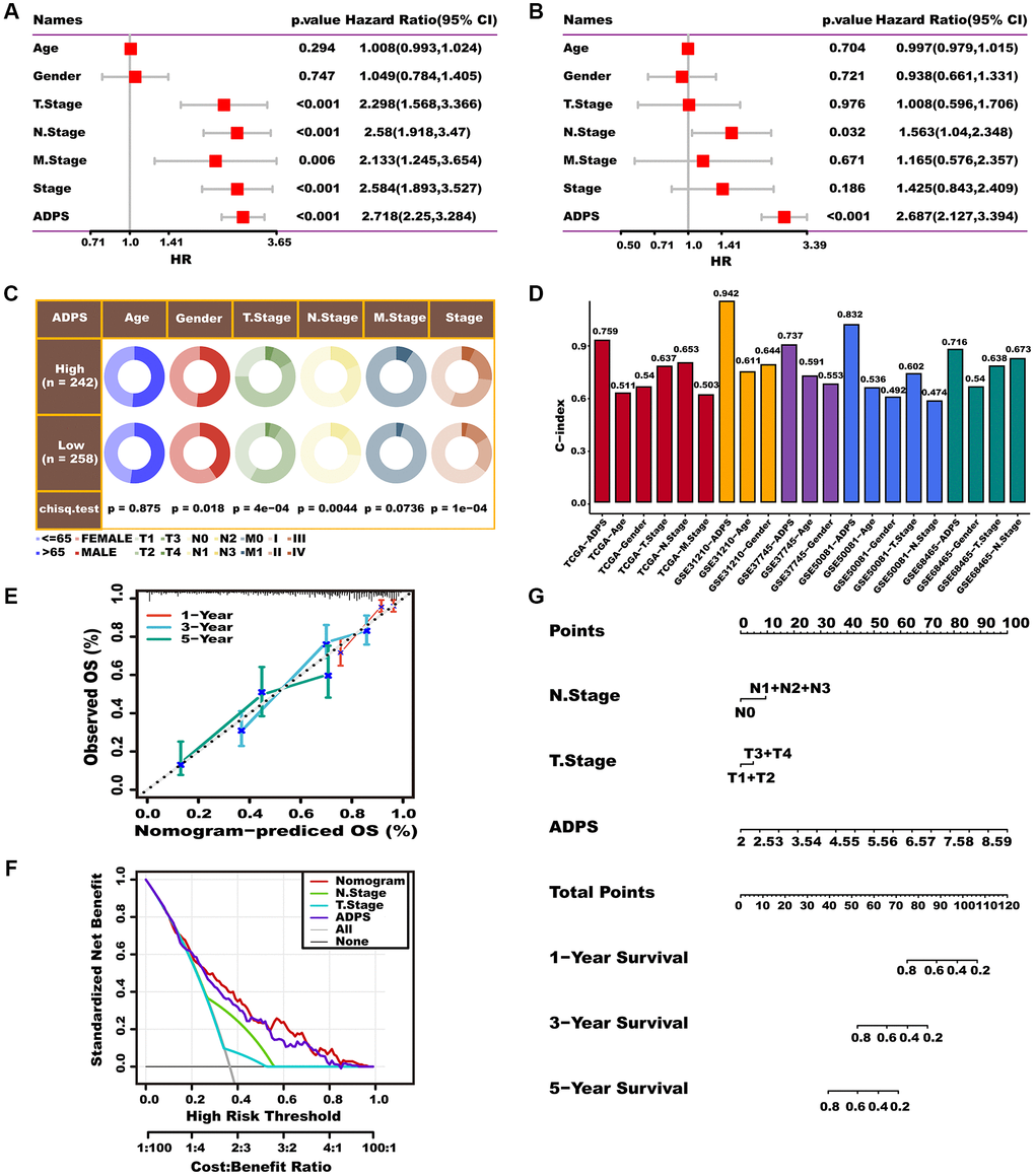 To better apply ADPS in a clinical setting and optimize its predictive performance, we performed univariate and multivariate Cox regression analysis to integrate clinicopathological characteristics as well as ADPS. ADPS was identified as the most significant independent prognostic factor of LUAD according to the results of univariate Cox analysis (hazard ratio (HR) = 2.718, 95% confidence interval (CI): 2.25–3.284, p < 0.001), as well as multivariate Cox regression analysis (hazard ration (HR) = 2.687, 95% confidence interval (CI): 2.127–3.394, p < 0.001), respectively (Figure 11A, 11B). The circos plot illustrated a significant correlation between ADPS and survival status, tumor stage, as well as TNM staging system in the TCGA cohort (Figure 11C). Moreover, the ADPS showed superior predictive accuracy, as indicated by the higher C-index values, compared to traditional clinical factors including age, gender, tumor stage, and TNM staging system, in various independent LUAD cohorts including TCGA, GSE31210, GSE37745, GSE50081, as well as GSE68465 (Figure 11D). Thus, a nomogram was created by integrating both the stage and ADPS, as illustrated in Figure 11G. The calibration plot illustrated the effective ability of the nomogram in predicting the actual survival outcomes (Figure 11E). Furthermore, the decision curve analysis (DCA) indicated that the nomogram had a superior ability to identify high ADPS patients compared to both the ADPS as well as stage alone, as illustrated in Figure 11F. TimeROC analysis indicated that the ADPS and nomogram had higher AUC values than other indicators (Supplementary Figure 4E). Our research further revealed that ADPS was significantly increased in the T stage (Supplementary Figure 4F), N stage (Supplementary Figure 4G), and tumor stage (Supplementary Figure 4I), without significant differences in M stage (Supplementary Figure 4H).