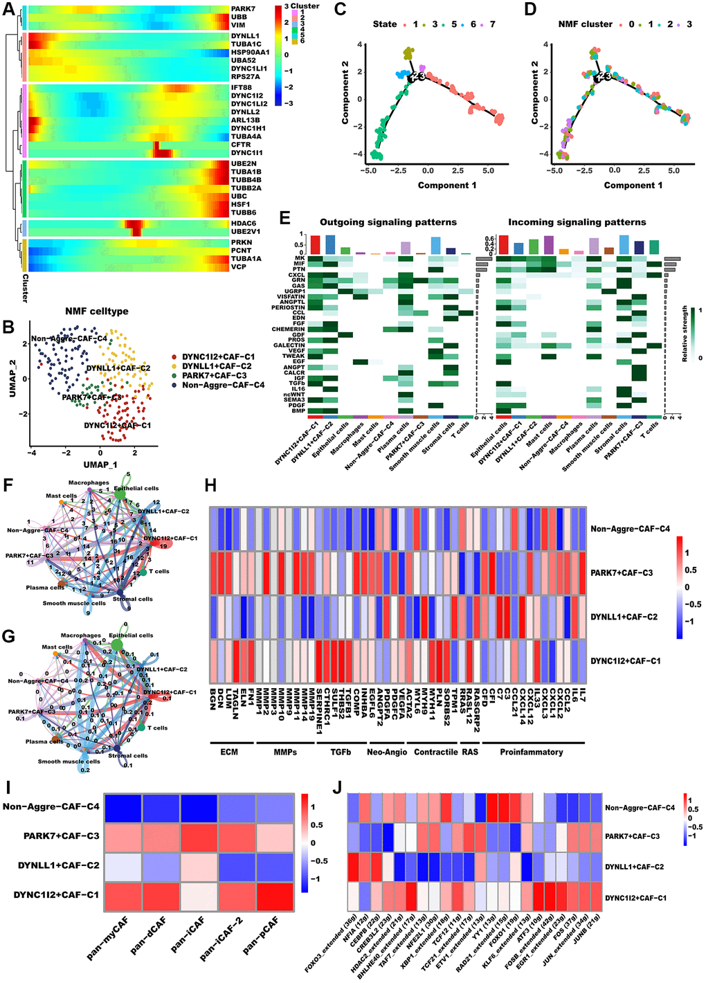Recent research has recognized CAFs as a key factor in TME, and they are emerging as a research hotspot [42]. Advancements in single-cell analysis techniques have led to a more comprehensive comprehension of the diversity and role of CAFs. For instance, according to one of the most well-established categorizations of CAFs, CAFs can be categorized as myCAF (myfibroblastic CAF), dCAF (development CAF), iCAF (inflammatory CAF), as well as pCAF (Pdpn CAF). Distinctive characteristics differentiate various subgroups of CAFs. Specifically, myCAF subset is situated in proximity to cancer cell nests and is characterized by elevated expression levels of both FAP+ and ꬰ-SMA. Conversely, the iCAF subset is localized far from cancerous cells and is marked by low expression levels of ꬰ-SMA but high expression levels of IL-6; the dCAF subset is distinguished by the activation of genes associated with diverse types of stem cells [43]. Similarly, to determine whether aggrephagy expression has an effect on CAFs, we performed a dimension reduction analysis. Pseudotime analysis reveals that aggrephagy genes are expressed at various developmental stages (Figure 2A). For instance, the early development stages of CAFs were characterized by the significant expression of TUBA4A, TUBA1C, and ARL13B, whereas TUBB4B, VIM, and TUBA1B were the feature of late development. Based on the NMF algorithm, CAFs were further divided into four clusters, and we identified that DYNC1I2+CAF−C1, DYNLL1+CAF−C2, PARK7+CAF−C3, as well as Non−Aggrephagy−CAF−C4 subtypes (Figure 2B, Supplementary Table 2). The developing status of NMF-based CAF clusters varied greatly as shown in pseudotime analysis (Figure 2C, 2D). Interestingly, using the Cellchat analysis, DYNC1I2+CAF−C1, DYNLL1+CAF−C2, and PARK7+CAF−C3 presented more and tighter connections with other cell types than Non-Aggre-CAF-C4 (Figure 2E–2G). GSVA was employed to derive scores for established classical CAF phenotype markers, with the aim of uncovering the possible phenotypes and functions of the aggrephagy CAF subtypes [44, 45] (Figure 2I). DYNC1I2+CAF−C1 showed the most prominent scores of pan-myCAF, pan-dCAF, and pan-pCAF, while PARK7+CAF−C3 exhibited the prominent scores of pan-iCAF. In contrast, Non-Aggrephagy-CAF-C4 had the lowest score among all classical CAF subtypes. In addition, we also investigated important CAF phenotype markers, like pro-inflammatory genes, neo-angiogenic genes, and MMPs. From the pathway heatmap (Figure 2H), aggrephagy-CAF subtypes had a significantly different expression of common pathway genes. PARK7+CAF−C3 had significantly higher expression of MMPs, ECM, Neo-Angio, and proinflammatory pathways genes, DYNC1I2+CAF−C1 had significantly higher expression of TGFb and RAS pathways gens, while Non-Aggre-CAF-C4 had lower expression of above pathways genes. Ultimately, we compared TF regulation features and subtype-specific TFs between aggrephagy-related CAFs as well as non-aggrephagy-related CAFs. We found that the average activities of TFs including FOS and ATF3 were exclusively higher in DYNC1I2+CAF−C1, while downregulated in DYNLL1+CAF−C2 except for FOXO3, NFIA, and CEBPB (Figure 2J). In aggregate, these discoveries imply that aggrephagy could exert a significant influence on CAF remodeling within the TME of LUAD.