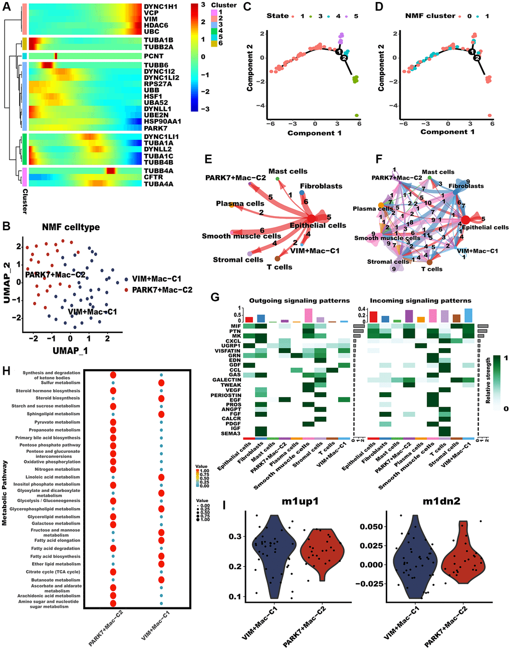 Subsequently, we investigated the potential impact of aggrephagy on the phenotypes and functions of TAMs. Throughout the pseudotime analysis, aggrephagy genes were observed to exhibit diverse expression patterns at different stages of macrophage development, implying their complex and dynamic roles in regulating the differentiation and function of macrophages (Figure 3A). NMF with aggrephagy genes separated macrophages into VIM+Mac−C1 and PARK7+Mac−C2 (Figure 3B, Supplementary Table 3). The developing status of NMF-based TAM clusters varied greatly as shown in pseudotime analysis (Figure 3C, 3D). Further, VIM+Mac−C1 and PARK7+Mac−C2 had comparatively stronger interactions with other cellular components, especially with epithelial cells (Figure 3E, 3F). We inferred the specific pathways of intercellular communication and found that mainly outgoing (secreting) of VIM+Mac−C1 and PARK7+Mac−C2 were EGF and VISFATIN, and incoming (target) signal pathways were PTN and MK (Figure 3G). A tumor microenvironment induces metabolic reprogramming of macrophages, leading to protumor macrophages having an overactive metabolism [37], we conducted scMetabolism algorithm to explore the metabolic heterogeneity in different aggrephay TAM subtypes (Figure 3H). Interestingly, the result revealed that the two TAM subtypes exhibit unique metabolic activation pathways, indicating that aggrephagy could be a critical modulator of metabolic regulation. For instance, PARK7+Mac−C2 was distinguished by the upregulation of multiple metabolic pathways such as glycolysis, TCA cycle, fatty acid degradation, as well as oxidative phosphorylation, while VIM+Mac−C1 was distinguished by the upregulation of fatty acid elongation and ether lipid metabolism. In addition, we computed the M1-like/M2-like polarization scores of different aggrephagy TAMs subtypes [46]. Notably, PARK7+Mac−C2 and VIM+Mac−C1 exhibited a preference for expressing genes that were upregulated in M1 macrophages, suggesting their enhanced M1-like anti-tumor functions (Figure 3I).
