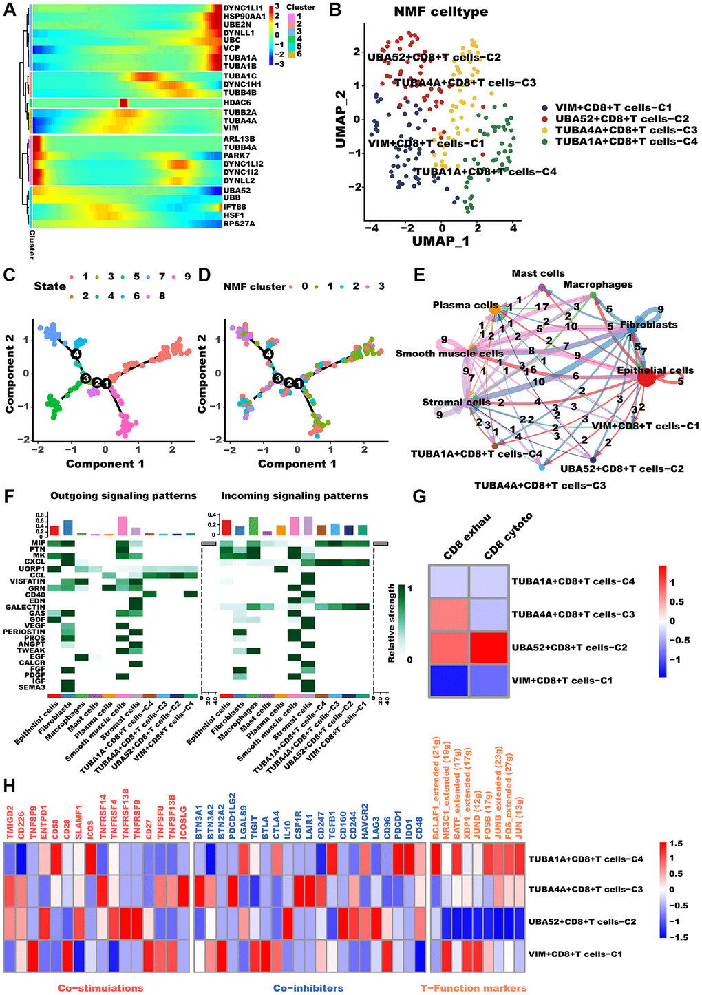 As CD8+T cells are known to significantly impact tumor metastasis and treatment outcomes, we conducted a comprehensive analysis of these cells [47]. Likewise, Monocle2 revealed that aggrephagy genes occupy different developmental stages (Figure 4A). TUBA1A, concordant with CAFs, was highly expressed during late development, while PARK7 and UBA52 were expressed during early development. Furthermore, CD8+T cells were categorized as four clusters via the NMF algorithm, and the developing status of NMF-based CD8+T cells varied greatly (Figure 4C, 4D, Supplementary Table 4), as well as named them as VIM+CD8+T cells C1, UBA52+CD8+T cells C2, TUBA4A+CD8+T cells C3, and TUBA1A+CD8+T cells C4, respectively (Figure 4B). Similarly, the aforementioned aggrephagy CD8+ T cells subtypes were found to have more extensive and robust interactions with other components of the TME, indicating their potential role in orchestrating the tumor immune microenvironment (Figure 4E). Furthermore, we inferred the specific pathways of intercellular communication and found that VIM+CD8+T cells C1 and TUBA1A+CD8+T cells C4 presented stronger activity in the CD40 pathways compared to UBA52+CD8+T cells C2, TUBA4A+CD8+T cells C3 (Figure 4F). We computed the T exhaustion and T cytotoxic scores for these aggrephagy related CD8+ T cell subtypes, utilizing a previously published panel for calculating scores that evaluate overall functions and phenotypes. These scores play a crucial role in determining the effects of ICB and its significance in LUAD progression [48]. Interestingly, we found that UBA52+CD8+T cells C2 showed higher T cytotoxic scores, TUBA4A+CD8+T cells C3 demonstrated higher T exhaustion scores but lower T cytotoxic scores, while VIM+CD8+T cells C1 and TUBA1A+CD8+T cells C4 presented lower both scores (Figure 4G), indicating TUBA4A likely to be involved in CD8+T cell exhaustion, result in tumor immune escape. In addition, we performed a comparison of the mean expression levels of genes related to T cell function and immune checkpoint inhibitors across these subtypes of CD8+ T cells. Consequently, VIM+CD8+T cells C1, UBA52+CD8+T cells C2, TUBA4A+CD8+T cells C3, and TUBA1A+CD8+T cells C4 exhibited different immune function-related terms (Figure 4H). Ultimately, we investigated the regulatory mechanisms through network regulatory analysis. TUBA1A+CD8+T cells C4 demonstrated apparent activation of TFs including FOS, JUNB, FOSB, BCLAF1, and BATF (Figure 4H). In conclusion, our investigation has illustrated the role of aggrephagy in the restructuring of CD8+ T cells within the TME of LUAD.