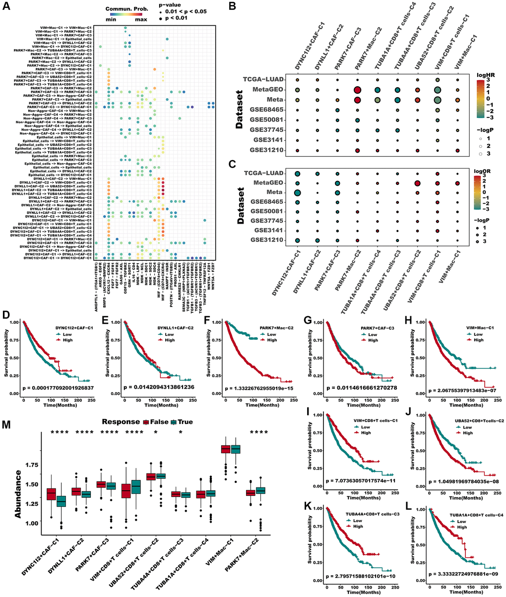 We have set out to investigate whether the newly defined aggrephagy subtypes have an impact on the survival rates of patients diagnosed with LUAD. Initially, we depicted the intercellular communication among all the aggrephagy-related subtypes, which elucidated all the possible connections between these subtypes (Figure 5A). Then we utilized ssGSEA algorithm to compute the enrichment score of each aggrephagy subtype based on the corresponding differentially expressed genes (Supplementary Table 5) and investigated their prognostic significance in LUAD patients across multiple cohorts. Through the implementation of univariate Cox regression analysis, we acquired the hazard ratio of each aggrephagy cell subtype in TCGA, GSE68465, GSE50081, GSE37745, GSE3141, GSE31210, Meta-GEO, and Meta cohorts, which showed that PARK7-Mac-C2, UBA52+CD8+T_cells−C2, PARK7+CAF-C3, and VIM+Mac-C1 were poor prognostic factors (Figure 5B, Supplementary Table 6). In addition, certain aggrephagy-related cell subtypes could distinguish the OS in TCGA, GSE68465, GSE50081, GSE37745, GSE3141, GSE31210, and Meta-GEO cohorts (Supplementary Figure 1A–1AJ). Remarkably, all cell subtypes related to aggrephagy were able to differentiate overall survival (OS) among meta-cohorts, which included 1512 patients with LUAD (Figure 5D–5L). Having established the potential role of aggrephagy in shaping the TME, we proceeded to investigate whether the aggrephagy-based patterns of TME had an impact on the response to ICB therapy. We employed the TIDE algorithm to predict the response of each patient to ICB therapy across multiple cohorts. Additionally, we observed that in the TCGA cohort, DYNC1I2+CAF−C1, DYNLL1+CAF−C2, and PARK7+CAF−C3, TUBA4A+CD8+T_cells−C3 were downregulated in responders, suggesting that these cells may be linked to ICB resistance (Figure 5M), which was verified in other cohorts (Supplementary Figure 2). Utilizing logistic regression, we obtained the odds ratio value for response prediction, unveiling the detrimental impact of these cells (Figure 5C, Supplementary Table 7). To verify the presence of the above cell types, we used IHC to observe cellular localization of DYNC1I2, TUBA1A, TUBA4A, UBA52 and VIM. We discovered that some of the fibroblasts in stromal did express DYNC1I2. (Figure 6A, first panel). Similarly, TUBA1A+ T cells were observed, showing significant positivity, from which immune cells were seen to exude (Figure 6A, second panel). TUBA4A was expressed on the cell nuclear of some T cells, with stromal cell nearby (Figure 6A, third panel). As a highly conserved nuclear and cytoplasmic protein, UBA52 was expressed in some T cells. As an immune cells, we also observed a high abundance of fibroblasts around UBA52+ T cells in pathological sections (Figure 6A, fourth panel). As we known, VIM was an epithelial-mesenchymal transition biomarker, highly expressed in stromal cell and tumor cell. In pathological sections, we found VIM was expressed in some macrophages, with tumor cell nearby. (Figure 6A, fifth panel).
