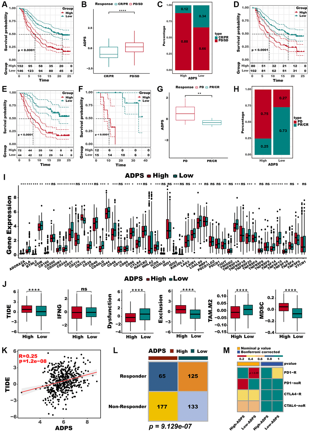 In addition, we evaluated the prognostic significance of ADPS about immunotherapy, utilizing the real-world cohort including IMvigor210 and GSE78220 datasets. Within the IMvigor210 cohort, which consisted of 298 patients, responses to anti-PD-L1 receptor blockers ranged from the complete response (CR) and partial response (PR) to stable disease (SD) and progressive disease (PD). A significant clinical benefit was observed in the low ADPS group of the IMvigor210 cohort compared with the high ADPS group (Figure 7A). CR/PR patients presented lower ADPS than SD/PD patients (Figure 7B, P < 0.0001). The low ADPS group displayed a higher percentage of CR/PR compared to the high ADPS group (Figure 7C). Survival differences between different ADPS groups were significant specifically in patients with Stage I+II (Figure 7D, P < 0.001), and in Stage III+IV patients (Figure 7E, P < 0.001). Our finding also indicated that patients with a low ADPS had a significantly better overall survival outcome compared to those with a high ADPS in the GSE78220 cohort (Figure 7F, P < 0.001). Besides, CR/PR patients also presented lower ADPS than SD/PD patients (Figure 7G, P < 0.01). Additionally, a higher percentage of SD/PD was observed in the high ADPS group as compared to the low ADPS group (Figure 7H). In addition to the abundance of immune checkpoints, we also noted a significantly higher expression of these checkpoints in the low ADPS group as compared to the high ADPS group (Figure 7I). Utilizing the TIDE web tool, we discovered that the low ADPS group had notably lower TIDE scores and higher rates of immunotherapy response compared to the high ADPS group (Figure 7J). There was a significant positive correlation observed between ADPS and TIDE score (Figure 7K). Responders to ICIs were found to be more prevalent among patients belonging to the high ADPS group, as predicted by the TIDE algorithm (Figure 7L, P < 0.001). Parallel to these findings, the subclass mapping analysis (Submap, modules in GenePattern, https://cloud.genepattern.org) also revealed similarities in expression patterns between patients with low ADPS and those with melanoma who responded to immunotherapy [49, 50] (A melanoma dataset that responded to immunotherapy was selected as the reference, while default settings were applied) responding to ICB (Figure 7M).