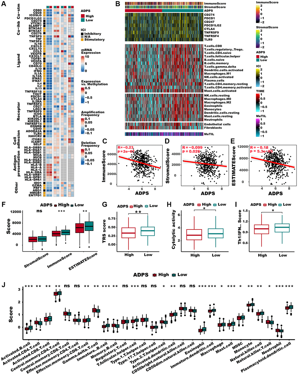 To explore the immune characteristics reflected by the ADPS, we investigated the association between the ADPS and immune cell type, immune scores, stromal scores, as well as critical immune checkpoint scores. Figure 8A, 8B demonstrated that the group with low ADPS exhibited elevated levels of immune infiltrating cells as well as immune modulators. This suggests the presence of an inflamed yet relatively immune-supportive microenvironment, which may be more conducive to benefiting from immunotherapy [51]. The immune score, stromal score, and ESTIMATE score had a negative correlation to ADPS, respectively (Figure 8C–8E). In parallel, patients in the low ADPS group had higher stromal, immune, and ESTIMATE scores compared to the high ADPS group (Figure 8F). Besides, we compared the status of the TRS score, Cytolytic activity, and Th1/IFN Score, which was more related to a more immunoreactive microenvironment between the two ADPS score groups [52, 53]. The results revealed that all of these indicators were significantly upregulated in the low ADPS group (Figure 8G–8I). According to 28 immune cells infiltration [54] assessed by ssGSEA (Figure 8J) and CIBERSORT algorithm (Supplementary Figure 4A), we further confirmed that the low ADPS group had markedly higher overall infiltration abundance than the high ADPS group. Thus, we defined the high ADPS group as “immune-cold” tumors and the low ADPS group as “immune-hot” tumors. Considering the upregulation of immune-related characteristics observed within the group of patients with a low ADPS, we sought to delve deeper into the biological mechanisms responsible for this phenomenon. KEGG-based GSVA analysis indicated the ADPS had a strong positive correlation with many pathways facilitating tumor growth, such as the P53 signaling pathway, cell cycle, glycolysis, and WNT signaling, while the immunological pathways, such as B/T cell receptor signaling pathways, cytokine receptor interaction pathway showed a weaker correlation with ADPS (Supplementary Figure 4B). Additionally, we further explored the immune characteristics from gene level, as displayed in Figure 9A, 9B, most ADPS-related genes were positively correlated with immune score as well as immune cell types.