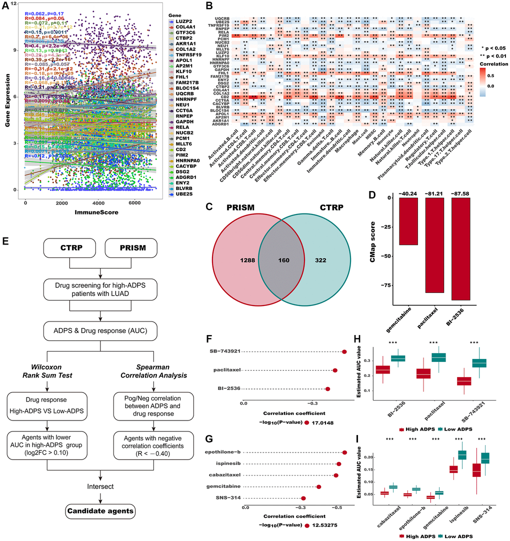 We followed the protocol outlined by Yang et al. [39] to identify potential agents for LUAD patients with high ADPS: (1) We downloaded drug sensitivity data for cancer cell lines (CCLs) from the Cancer Therapeutic Response Portal (CTRP, includes 481 compounds over 835 CCLs, https://portals.broadinstitute.org/ctrp) and profiling relative inhibition simultaneously in mixtures (PRISM, includes 1448 compounds over 482 CCLs, https://www.theprismlab.org/) datasets, as well as expression data of CCLs from the Cancer Cell Line Encyclopedia (CCLE, https://portals.broadinstitute.org/ccle/) database. (2) The CTRP and PRISM datasets possess AUC values, and decreased AUC values indicate heightened responsiveness to this compound. (3) Using the Wilcoxon rank-sum test, we conducted a differential analysis of drug response between the top 10% (high ADPS group) and bottom 10% (low ADPS group) of samples. We set a threshold of log2FC >0.1 to identify compounds with significantly lower AUC values in the high ADPS group. (4) Furthermore, we employed Spearman correlation analysis to detect compounds with AUC values that showed negative correlation coefficients (using a threshold of R < -0.4) for subsequent screening. (5) We further identified potential agents by taking the intersection of the compounds obtained from steps (3) and (4). In the end, according to differential expression analysis, we identified potential agents using Connectivity Map (CMap, https://clue.io/) [40] to further verify the agents derived from the CTRP and PRISM databases.