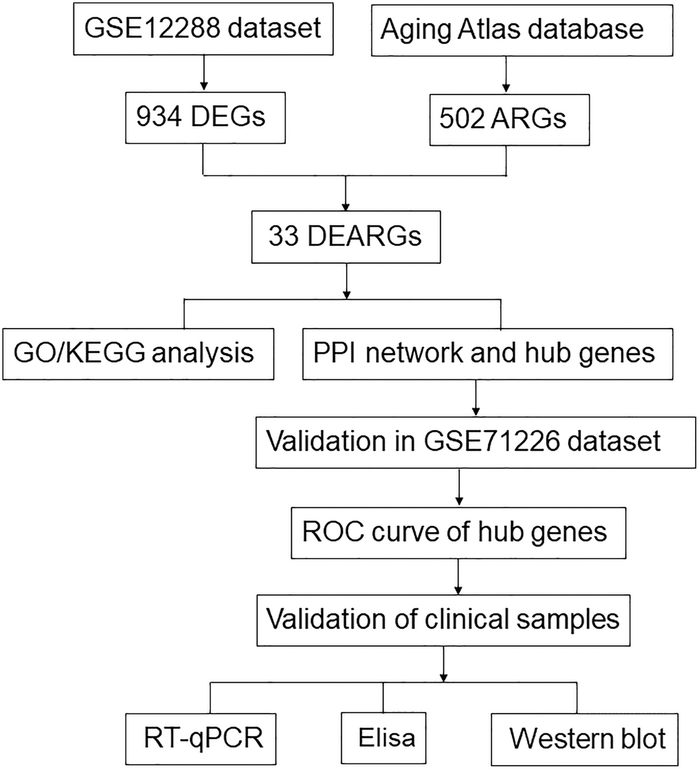 In this study, we examined the relationship between ARGs and CAD using bioinformatics methods for the first time. We screened differentially expressed ARGs (DEARGs) based on the Gene Expression Omnibus (GEO) and Aging Atlas database. Gene Ontology (GO) enrichment analysis, Kyoto Encyclopedia of Genes and Genomes (KEGG) enrichment analysis, and protein–protein interaction (PPI) analysis were performed on the DEARGs. In addition, we used multiple algorithms from Cytoscape software to screen hub genes and validate them with a separate dataset. Blood samples were collected, and the mRNA and protein expression levels of hub genes in whole blood from patients in the CAD group and control group were detected by real-time quantitative polymerase chain reaction (RT-qPCR), enzyme-linked immunosorbent assay (ELISA), and western blot. Finally, the hub genes of DEARGs in CAD were identified. A flow chart of this study is shown in Figure 1.