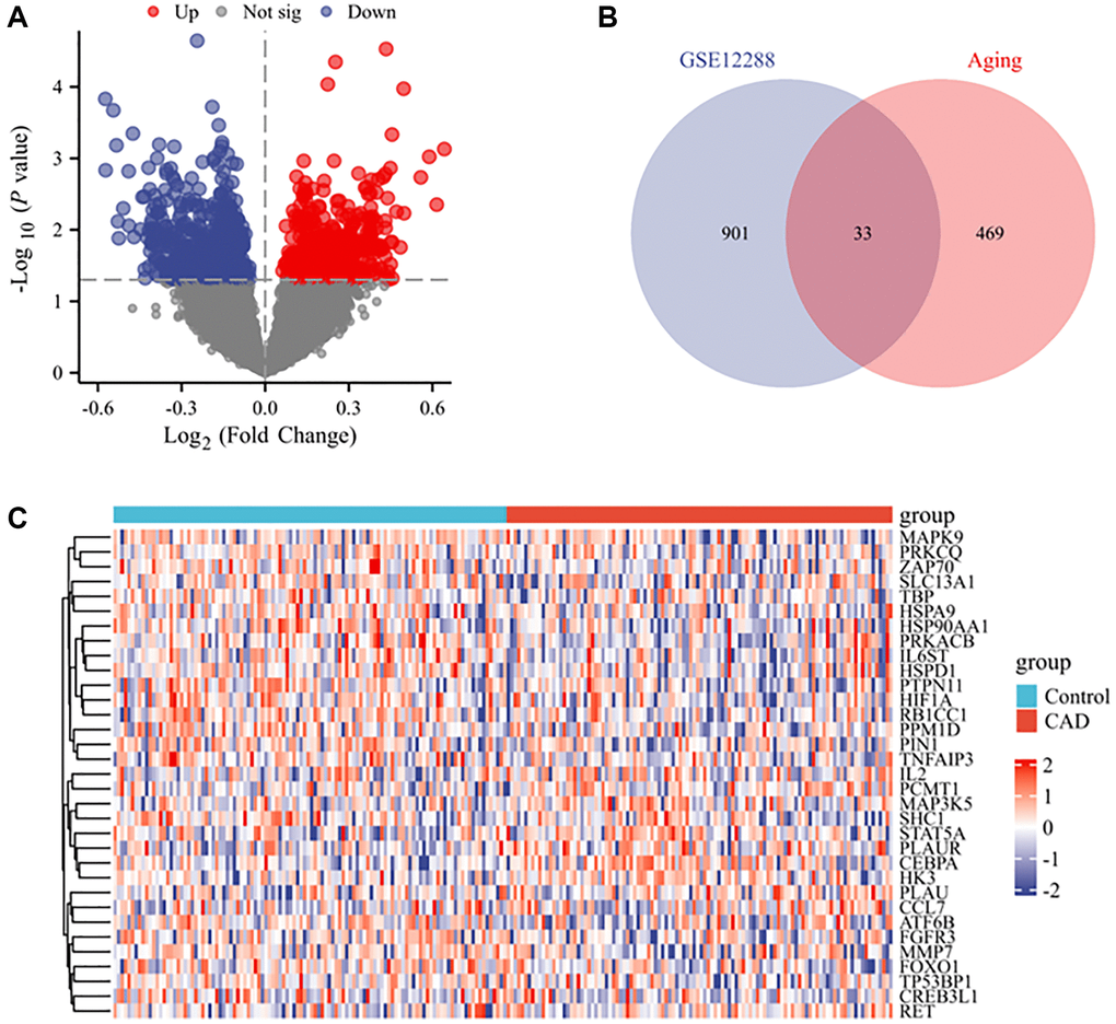 In the GSE12288 dataset, 934 differentially expressed genes (DEGs) (404 upregulated and 530 downregulated) were identified between CAD and control samples, with P < 0.05 as the cut-off value (Figure 2A). These 934 DEGs were compared with 502 ARGs in the Aging Atlas database, and 33 DEARGs were identified in both datasets (Figure 2B). Among the 33 genes, 10 genes were upregulated (IL2, CCL7, PLAU, CEBPA, RET, MAP3K5, HK3, PLAUR, PCMT1, and STAT5A) and 23 genes were downregulated (SLC13A1, PIN1, FGFR3, MMP7, ATF6B, MAPK9, CREB3L1, IL6ST, HIF1A, PRKACB, PTPN11, TBP, RB1CC1, PRKCQ, FOXO1, HSP90AA1, ZAP70, PPM1D, TP53BP1, TNFAIP3, HSPA9, HSPD1, and SHC1) (Figure 2C).