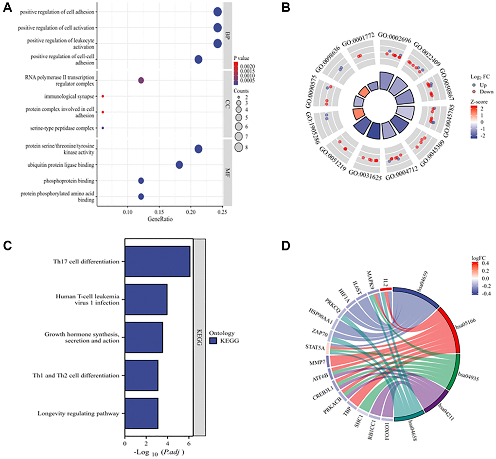 The functional enrichment analysis chart of the DEARGs shows the four most significantly enriched GO terms (Figure 3A, 3B). The enriched biological processes include positive regulation of cell adhesion, positive regulation of cell activation, positive regulation of leukocyte activation, and positive regulation of cell–cell adhesion. The enriched cellular components include RNA polymerase II transcription regulator complex, immunological synapses, protein complexes involved in cell adhesion, and serine-type peptidase complex. The enriched molecular functions are protein serine/threonine/tyrosine kinase activity, ubiquitin protein ligase binding, phosphoprotein binding, and protein phosphorylated amino acid binding. The KEGG enrichment analysis revealed that DEARGs play key roles in Th17 cell differentiation; human T-cell leukemia virus 1 infection; growth hormone synthesis, secretion, and action; Th1 and Th2 cell differentiation; and longevity-regulating pathways (Figure 3C, 3D).