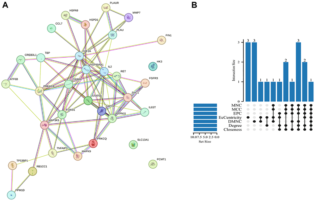 PPI networks were constructed using the STRING database to identify interactions between DEARGs and further visualize the results comprising 33 nodes and 86 edges. Figure 4A shows the PPI network of the DEARGs. The circles represent genes, the lines represent PPIs between genes, and the results in the circles represent the protein structure. The colors of the lines represent evidence of PPIs. We used various algorithms from the Cytoscape software Cytohubba plugin, including Degree, MCC, MNC, EPC, DMNC, EcCentricity, and Closeness, to identify hub genes. We then created an UpSet map to visualize the results (Figure 4B). Finally, six hub genes were obtained: CEBPA, HIF1A, HSP90AA1, IL2, FOXO1, and STAT5A (Table 1).