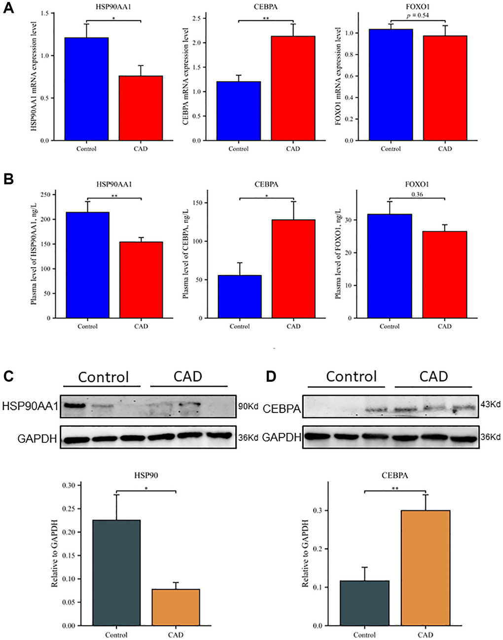 The ELISA results showed that the plasma levels of HSP90AA1, CEBPA, and FOXO1 were consistent with mRNA expression (Figure 6B). The levels of HSP90AA1 in plasma samples of the control group and CAD group were 214.18 ± 135.33 and 154.08 ± 57.13 ng/L, respectively (P < 0.01). The plasma CEBPA concentration was significantly higher in the CAD group than in the control group (127.78 ± 134.37 vs. 55.56 ± 85.59 ng/L, respectively; P < 0.05). The expression level of FOXO1 was lower in the CAD group than in the control group (26.51 ± 14.46 vs. 31.74 ± 27.42 ng/L, respectively), but the difference was not statistically significant (P = 0.36). Western blot analysis showed that the level of HSP90AA1 protein in peripheral blood mononuclear cells (PBMCs) was lower in the CAD group than in the control group (Figure 6C), while the level of CEBPA protein was significantly higher in the CAD group than in the control group (Figure 6D). Possibly due to the low expression of FOXO1 in PBMCs, we were unable to visualize FOXO1 with western blot and therefore could not evaluate it.