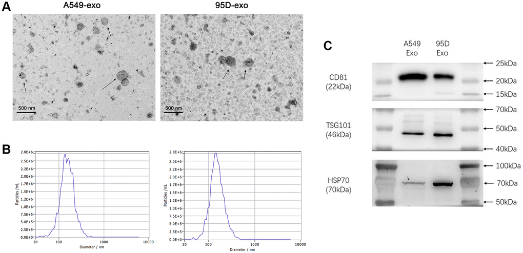 We used TEM, NTA, and western blot to characterize the isolated exosomes to determine the quality of exosomes from cell culture supernatants. TEM showed that the isolated exosomes were typically saucer-shaped vesicles with lipid bilayer membranes (Figure 1A). The NTA results revealed that the diameter of exosomes varied from 30 nm to 150 nm, and the exosomes from cell culture supernatants had a similar particle size distribution and peak area (Figure 1B). Western blot was used to detect the molecular markers for exosomes. As shown in Figure 1C, the exosomes from cell culture supernatants were found to be positive for exosome-associated markers such as CD81, TSG101, and HSP70. These results indicated that exosomes were successfully isolated from the cell culture supernatants.