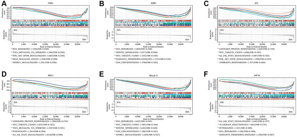 To further investigate the potential function of the seven real hub genes involved in the progression of lung cancer, GSEA analysis was performed based on the microarray dataset GSE175601. GSEA was employed to perform a hallmark gene sets analysis for FXR1, KRAS, ESR1, KIT, MCL1, BCL2L11, and HIF1A. FXR1 (Figure 10A), ESR1 (Figure 10B), BCL2L11 (Figure 10E), and HIF1A (Figure 10F) were all enriched in DNA repair. KIT (Figure 10C), MCL1 (Figure 10D), and HIF1A (Figure 10F) were all enriched in IL6/JAK/STAT3 signaling. ESR1 (Figure 10B) and BCL2L11 (Figure 10E) were all enriched in the G2/M checkpoint, mitotic spindle, and MYC targets v1. KIT (Figure 10C) and MCL1 (Figure 10D) were all enriched in MYC targets v2 and unfolded protein response. FXR1 and KIT were all enriched in PI3K/AKT/ mTOR signaling. FXR1 (Figure 10A) and MCL1 (Figure 10D) were all enriched in TNFα signaling via NF-kB. FXR1 (Figure 10A) and BCL2L11 (Figure 10E) were all enriched in mTORC1 signaling. ESR1 (Figure 10B) and HIF1A (Figure 10F) were all enriched in oxidative phosphorylation. MCL1 (Figure 10D) and HIF1A (Figure 10F) were all enriched in hypoxia. However, GSEA analysis of KRAS showed that there was no statistical significance according to the values of |NES| and FDR (Supplementary Figure 2). Some of the above-mentioned pathways have been demonstrated to be closely related to BM of lung cancer. Noticeably, these pathways were significantly involved in bone metastatic samples.