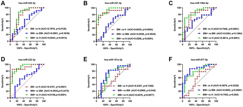 Statistical analyses were conducted using GraphPad Prism software (version 8.0; USA). According to each miRNA expression value, the receiver-operating characteristic (ROC) curve and the area under the ROC curve (AUC) were performed to estimate the sensitivity and specificity of each identified key exo-miRNA for the discriminating BM+ group from BM- group and the healthy controls. The AUC was calculated with 95% confidence intervals. p < 0.05 was considered significant.