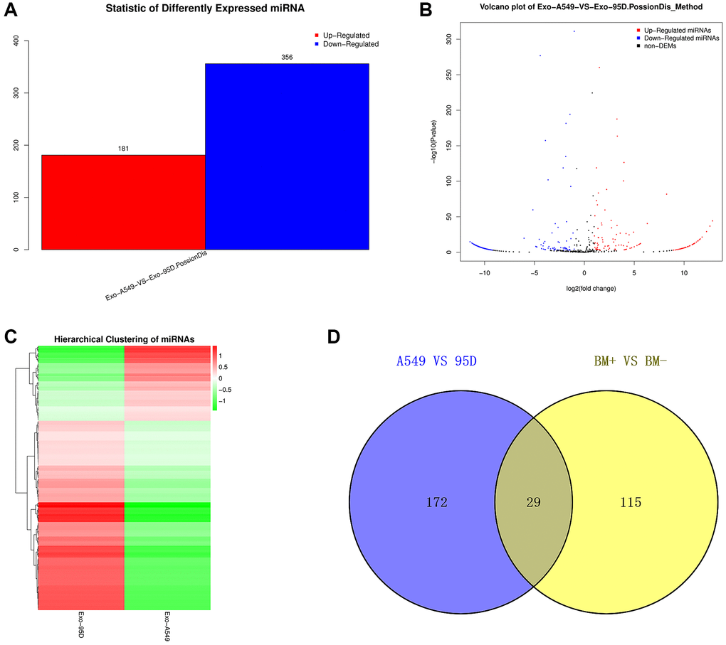 To identify candidate exo-miRNAs related to BM in lung cancer, we intersected the data published by Xiao-Rong Yang in 2021 and our data obtained from small RNA sequencing. In total, we screened out 29 overlapping exo-miRNAs (Figure 2D and Table 1). These 29 miRNAs were considered as candidate exo-miRNAs.