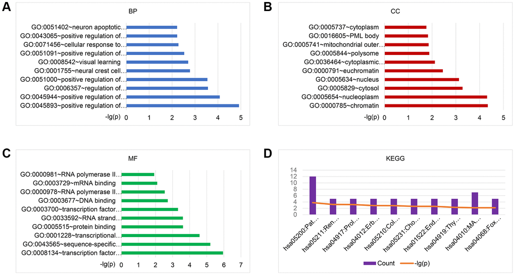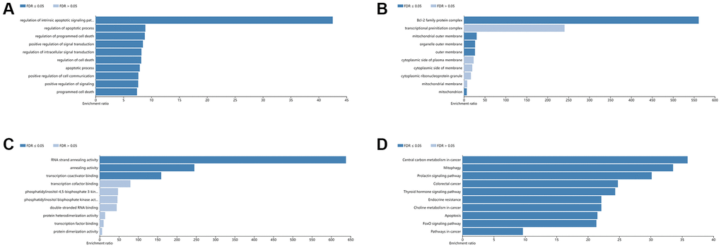 GO and KEGG pathway analyses for the identified 10 hub genes were then performed using the Webgestalt database. The results indicated that in terms of BP, the top 5 were regulation of the intrinsic apoptotic signaling pathway, regulation of the apoptotic process, regulation of programmed cell death, positive regulation of signal transduction, and regulation of intracellular signal transduction (Figure 5A). According to CC, the top 5 were the Bcl-2 family protein complex, mitochondrial outer membrane, organelle outer membrane, outer membrane, and mitochondrion (Figure 5B). For the analysis of MF, the identified 10 hub genes were enriched in RNA strand annealing activity, annealing activity, and transcription coactivator binding (Figure 5C). KEGG analysis revealed that the top 5 pathways identified were central carbon metabolism in cancer, mitophagy, prolactin signaling pathway, colorectal cancer, and thyroid hormone signaling pathway (Figure 5D).