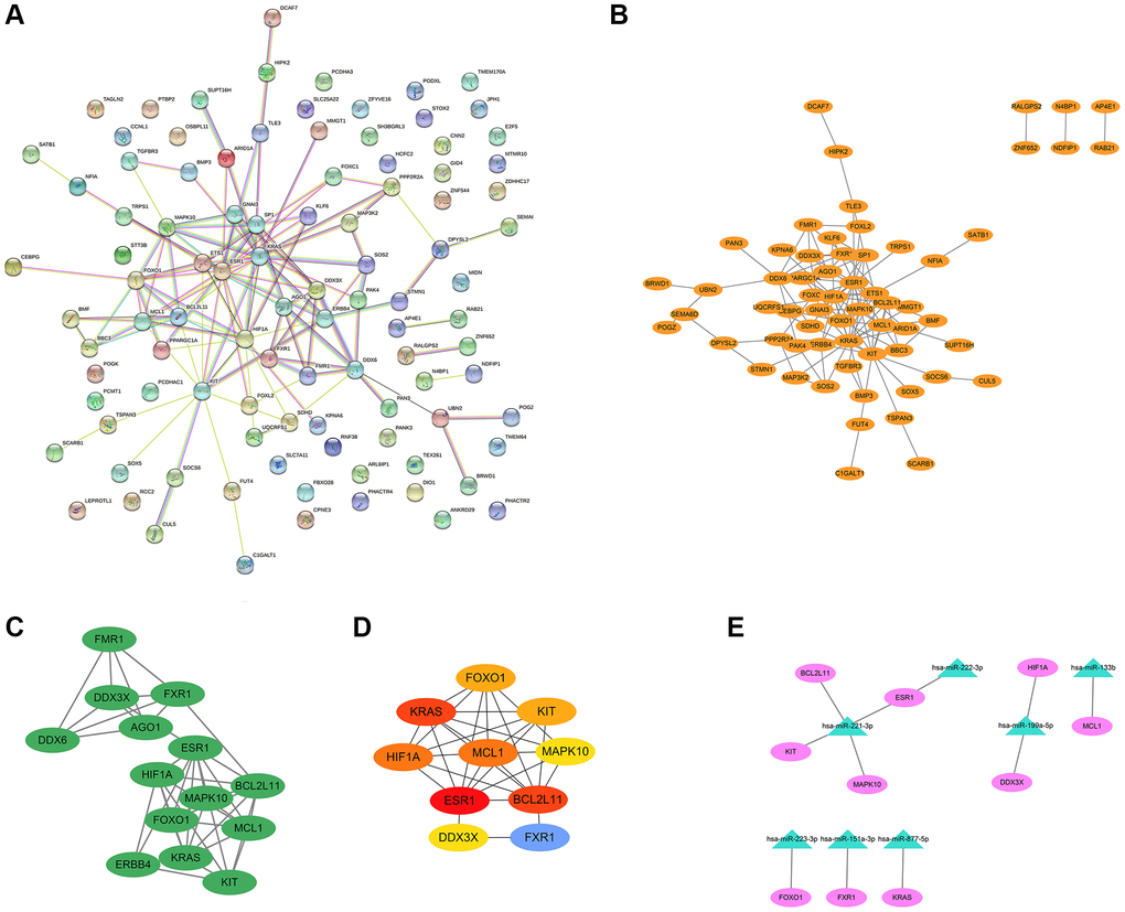 Search Tool for the Retrieval of Interacting Genes (STRING) online tool (https://www.stringdb.org/) was used to acquire the PPI network for the candidate mRNAs and only the interactions with a combined score >0.4 were considered to indicate a significant interaction. Subsequently, the PPI network was visualized with Cytoscape software (Version 3.9.1) [32]. Furthermore, the module analysis was carried out by the plug-in Molecular Complex Detection (MCODE, version 2.0.2). The criteria were defined as follows: degree cutoff = 2, node score cutoff = 0.2, k-core = 2, and max depth = 100.