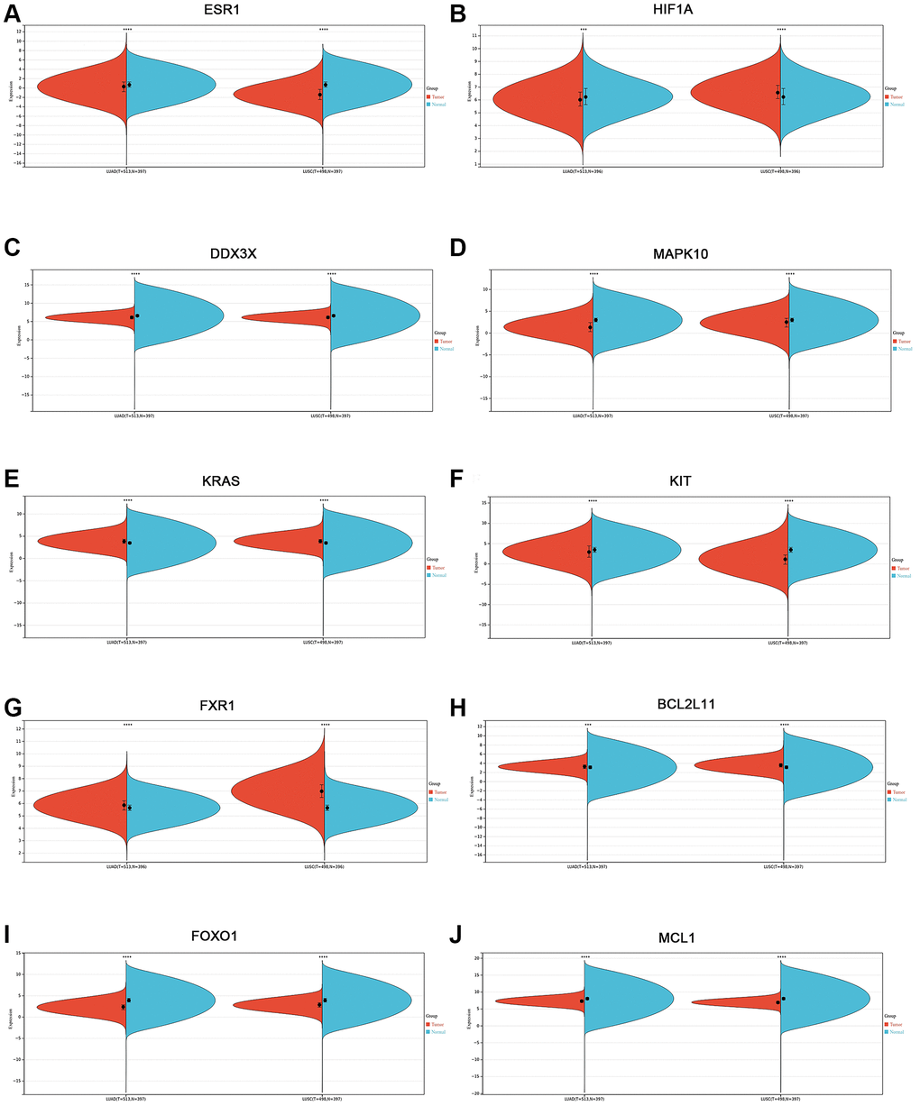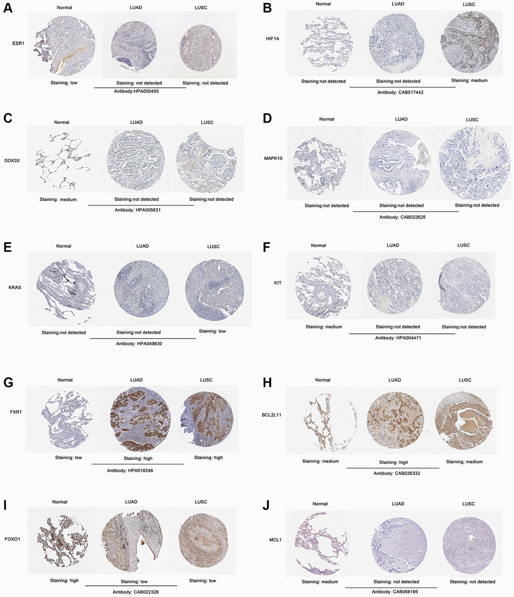 To confirm the expression level of the identified 10 hub genes in lung cancer, we used mRNA expression data from the Sangerbox website database. The results showed that the mRNA expression levels of ESR1 (Figure 6A), DDX3X (Figure 6C), MAPK10 (Figure 6D), KIT (Figure 6F), FOXO1 (Figure 6I), and MCL1 (Figure 6J) were significantly lower in both lung adenocarcinoma (LUAD) and lung squamous cell carcinoma (LUSC) tissues (p < 0.001) than normal lung tissues. The mRNA expression levels of KRAS (Figure 6E), FXR1 (Figure 6G), and BCL2L11 (Figure 6H) were markedly upregulated in both LUAD and LUSC tissues (p < 0.001) compared with those in normal lung tissues. Interestingly, the HIF1A mRNA expression level of LUAD tissues was significantly lower than that of normal lung tissues (p < 0.001) (Figure 6B). In contrast, the mRNA expression level of HIF1A was markedly increased in LUSC tissues, compared with the normal lung tissues (p < 0.001) (Figure 6B). Next, we used the Human Protein Atlas to assess the protein expression levels of the identified 10 hub genes in lung cancer. The results showed that the protein expression levels of the identified 10 hub genes (ESR1, HIF1A, DDX3X, MAPK10, KRAS, KIT, FXR1, BCL2L11, FOXO1, and MCL1) displayed similar patterns of changes as the mRNA expression levels (Figure 7A–7J).